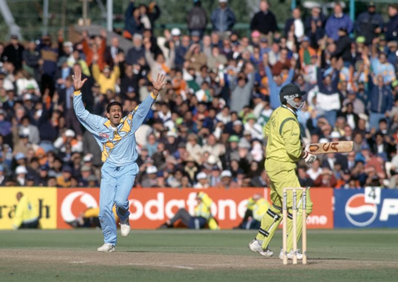 Anil Kumble celebrates after trapping Saqlain Mushtaq LBW for 0 during the World Cup Super Six match between India and Pakistan at Old Trafford, Manchester, on June 8, 1999