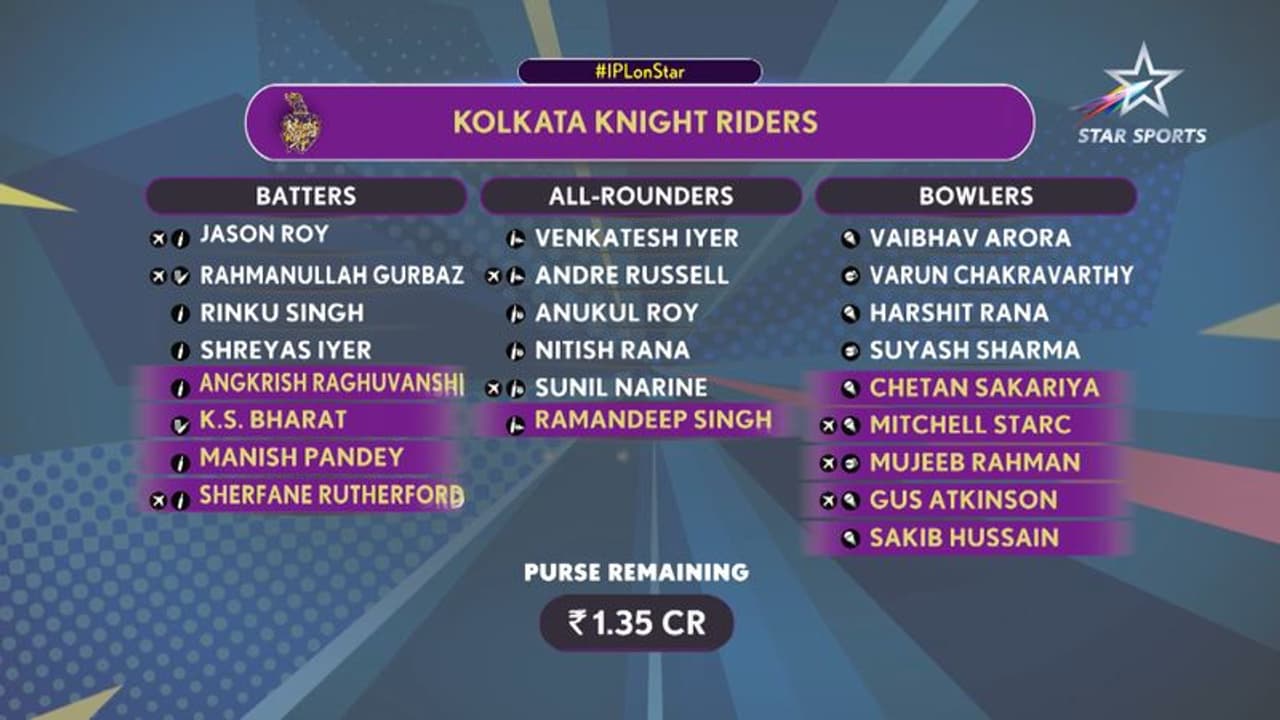 Despite splurging a staggering Rs 24.75 crore on Mitchell Starc, their second acquisition following Chetan Sakariya, KKR showcased astuteness in securing valuable backup players during the auction. The addition of Mujeeb Ur Rahman for Sunil Narine, KS Bharat for Rahmanullah Gurbaz, and Sherfane Rutherford for Andre Russell demonstrated strategic planning. A late addition to their squad, Gus Atkinson, an English right-arm pace bowler, aims to provide additional depth to their bowling lineup. However, Kolkata's shortfall was evident in their approach to batting depth. While their signings indicate a significant reliance on Gurbaz as an opener, they will have to place trust in the unproven abilities of Ramandeep Singh at No. 7. Singh exhibited promise by scoring 77 runs in 36 balls at a strike rate of over 200 across three innings at that position and lower during the 2023 Syed Mushtaq Ali Trophy.