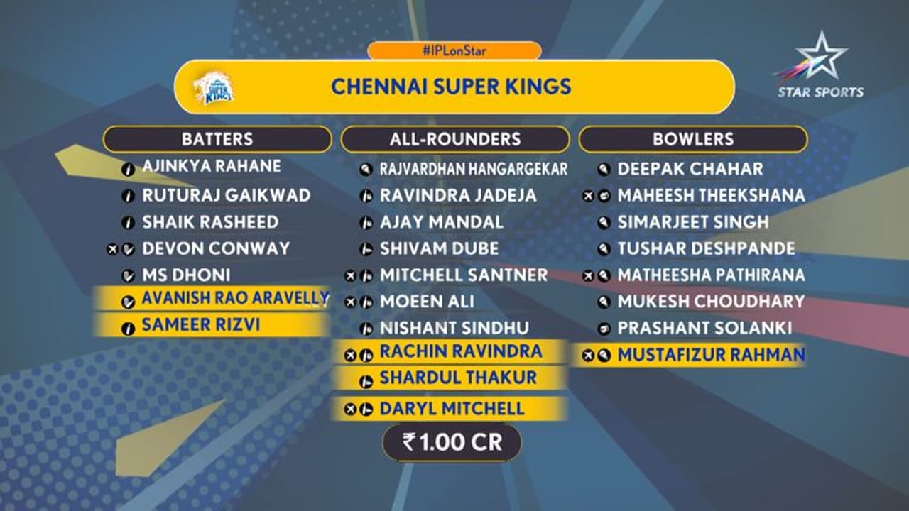 Faced with the crucial task of finding a replacement for Ben Stokes, the team aggressively pursued Pat Cummins, even bidding as high as Rs 7.6 crore. However, they ultimately secured the services of New Zealand all-rounders Daryl Mitchell and Rachin Ravindra. Mitchell, known for his explosive batting, particularly demonstrated in his two World Cup centuries against India, aligns well with the requirements of Chepauk, as acknowledged by head coach Stephen Fleming. Meanwhile, Rachin Ravindra could serve as a valuable backup for Moeen Ali, who faced a dip in form in the last season. In addition to retaining bowling all-rounder Shardul Thakur, Chennai also added Mustafizur Rahman to their roster, a bowler well-suited for the challenging conditions with his effective cutters.