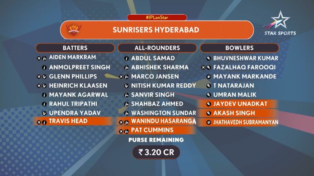 Assessing their performance at the auction, their acquisitions on Tuesday have created a pleasant predicament concerning their four overseas slots. However, the team lacks a robust leadership core, despite the addition of Australia's ODI World Cup-winning captain Pat Cummins, secured with a substantial bid of Rs 20.5 crore. Cummins joins the existing leadership group comprising Aiden Markram, Bhuvneshwar Kumar, and Mayank Agarwal. The addition of Travis Head aims to address their struggles in the initial phases of matches, while the inclusion of Wanindu Hasaranga stands out as an exceptional and economical deal. As they head into the 2024 season, SRH boasts an almost complete XI to rely upon.