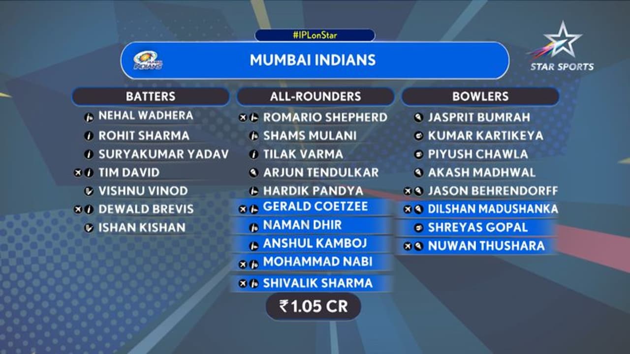 Examining their pace-bowling arsenal, apart from Jasprit Bumrah and Jason Behrendorff, the team has bolstered its options with Sri Lanka's left-arm seamer Dilshan Madushanka, a standout performer in the World Cup, and South Africa's all-rounder Gerald Coetzee, known for his batting prowess lower down the order. Adding to the mix, they surprised many by acquiring Nuwan Thushara from Sri Lanka, often likened to the legendary Lasith Malinga. However, their shortcoming lay in not aggressively pursuing an overseas spinner to complement Piyush Chawla. Nonetheless, they secured the services of Shreyas Gopal.