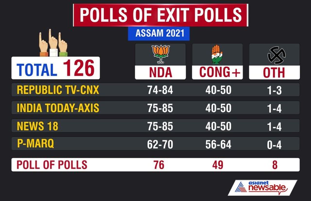 The much-awaited exit poll results predict that the Bhartiya Janta Party (BJP) is all set to retain power in Assam where it won for the first time in 2016.