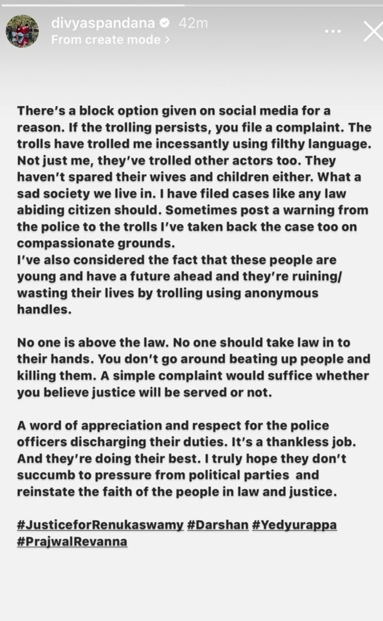 Ramya concluded her statement by commending the efforts of law enforcement personnel involved in the case. "I express my gratitude to the police for their diligent work," she conveyed, acknowledging their challenges in maintaining law and order. "Their dedication is commendable," she added, calling for unwavering support to ensure justice prevails.