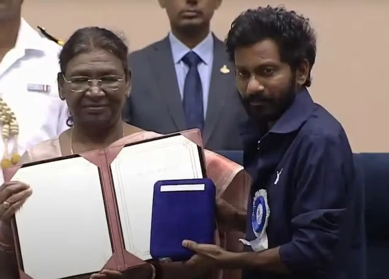 President Murmu presented the prize to Anjan Bose, Rajdeep Paul, and Sharmistha Maiti for the Bengali film 'Kalkhokkho: House of Time'.