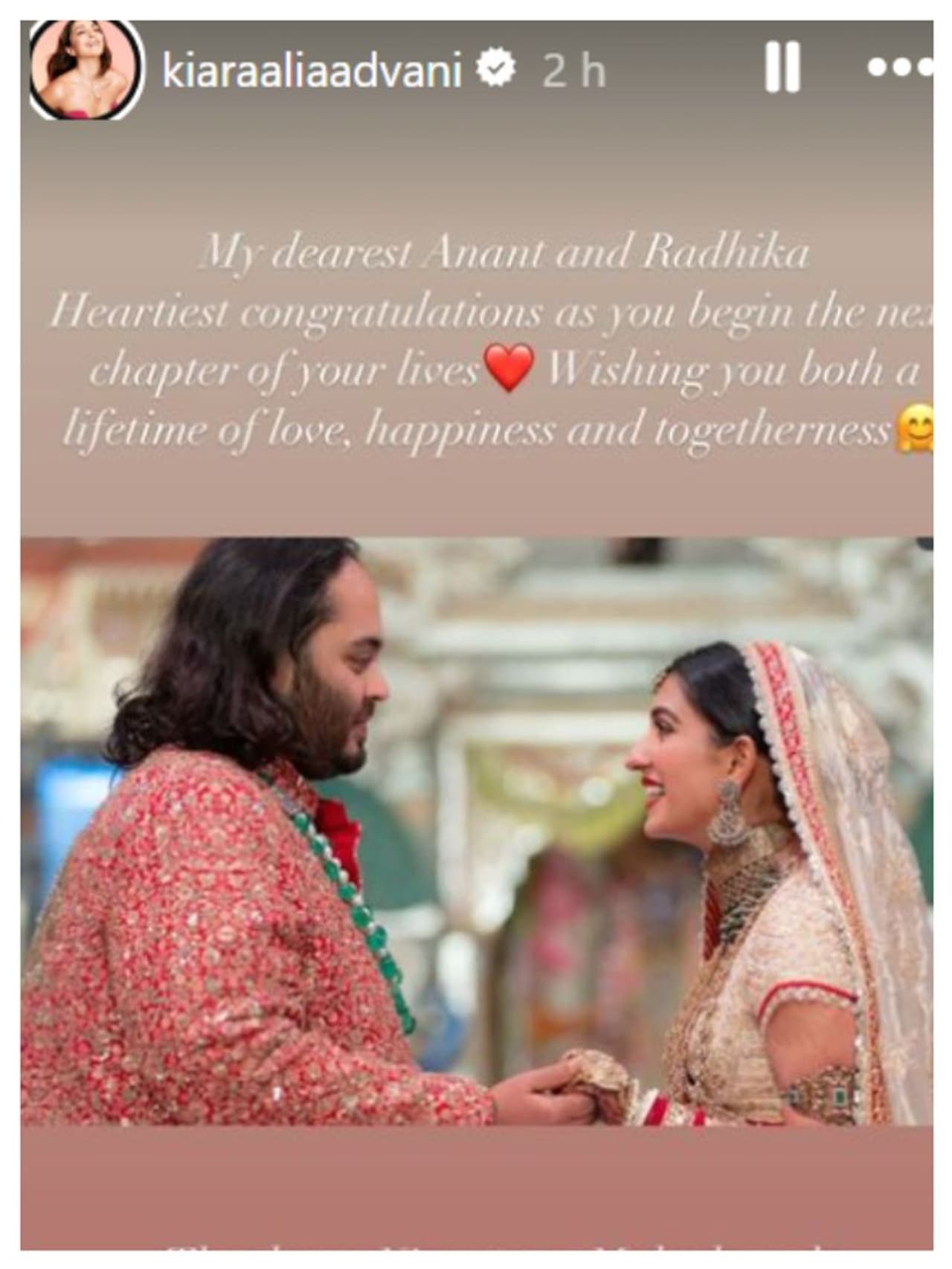 Kiara Advani took to Instagram to extend her wishes to the newlyweds, sharing a lovely photo and writing, “My dearest Anant and Radhika, heartiest congratulations as you begin the next chapter of your lives. Wishing you both a lifetime of love, happiness, and togetherness.”