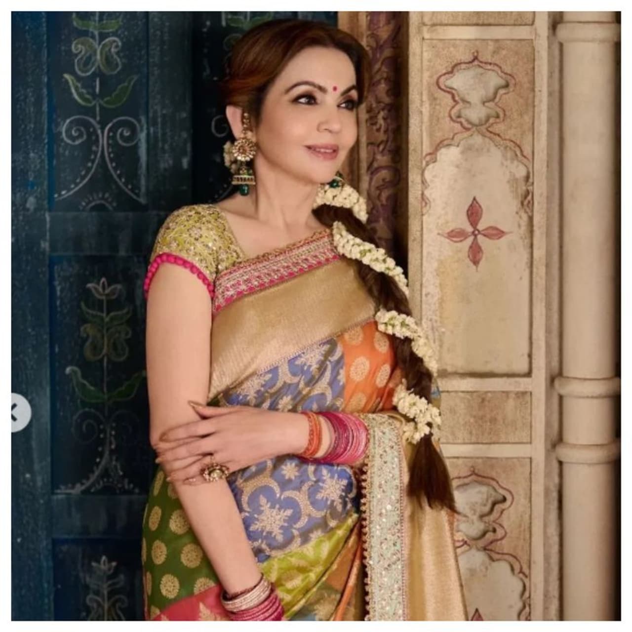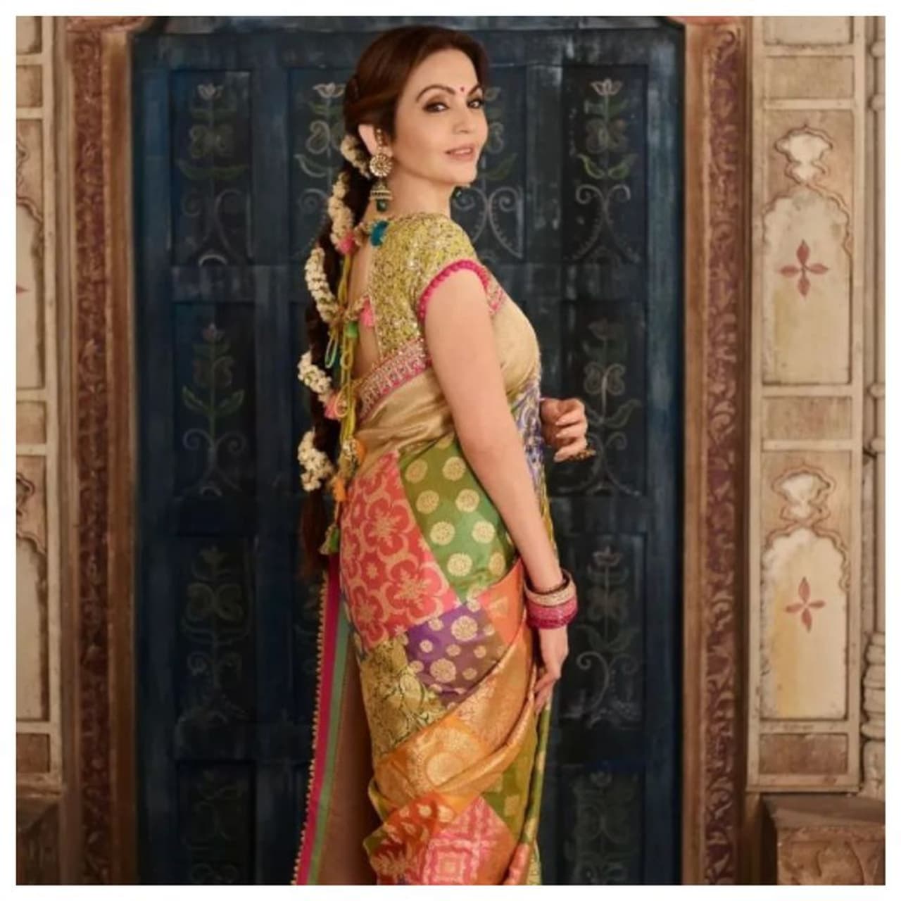 Nita Ambani's dedication to preserving and showcasing India's cultural heritage is evident in the thoughtful details of the wedding. She donned a stunning 28 chauk jaal Rangkat saree, designed and styled by Manish Malhotra in collaboration with Swadesh and Manish Malhotra World. This saree, adorned with delicate floral motifs and vibrant zari hues, is a tribute to the incredible craftsmanship of India’s artisans.