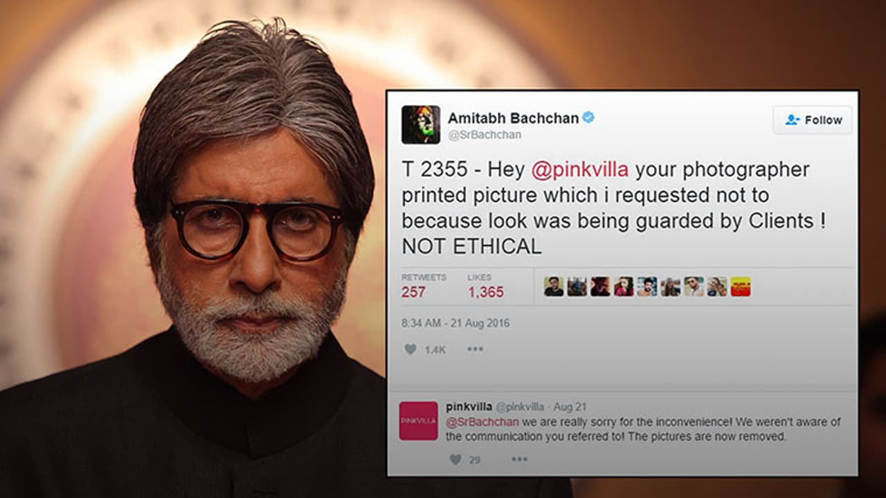 So far so good. But things took a downturn the next day, with Bachchan discovered that many digital publications had put up the images anyway. Losing his cool, he picked on one of them in series of angry tweets, accusing them of unethical conduct.