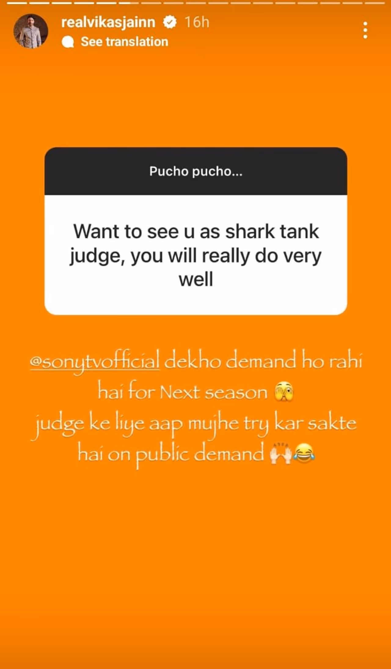 Vicky Jain responded by tagging Sony TV and playfully asking if he might be part of the next season. “Dekho demand ho rahi hai for next season. Judge ke liye aap mujhe try kar sakte hai on public demand (See, people want to see me as a judge. You can consider me for the next season on public demand),” he wrote.