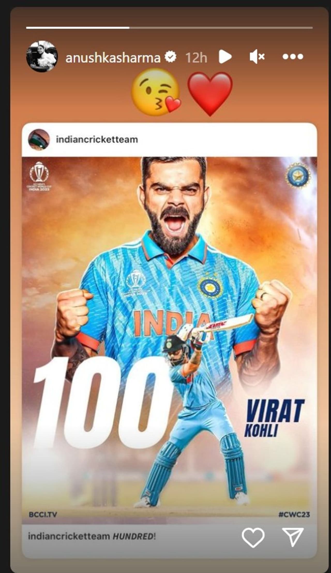 Anushka Sharma congratulated Virat Kohli for scorning a century in the ongoing World Cup 2023. Virat went not out for 103 runs in 97 balls.