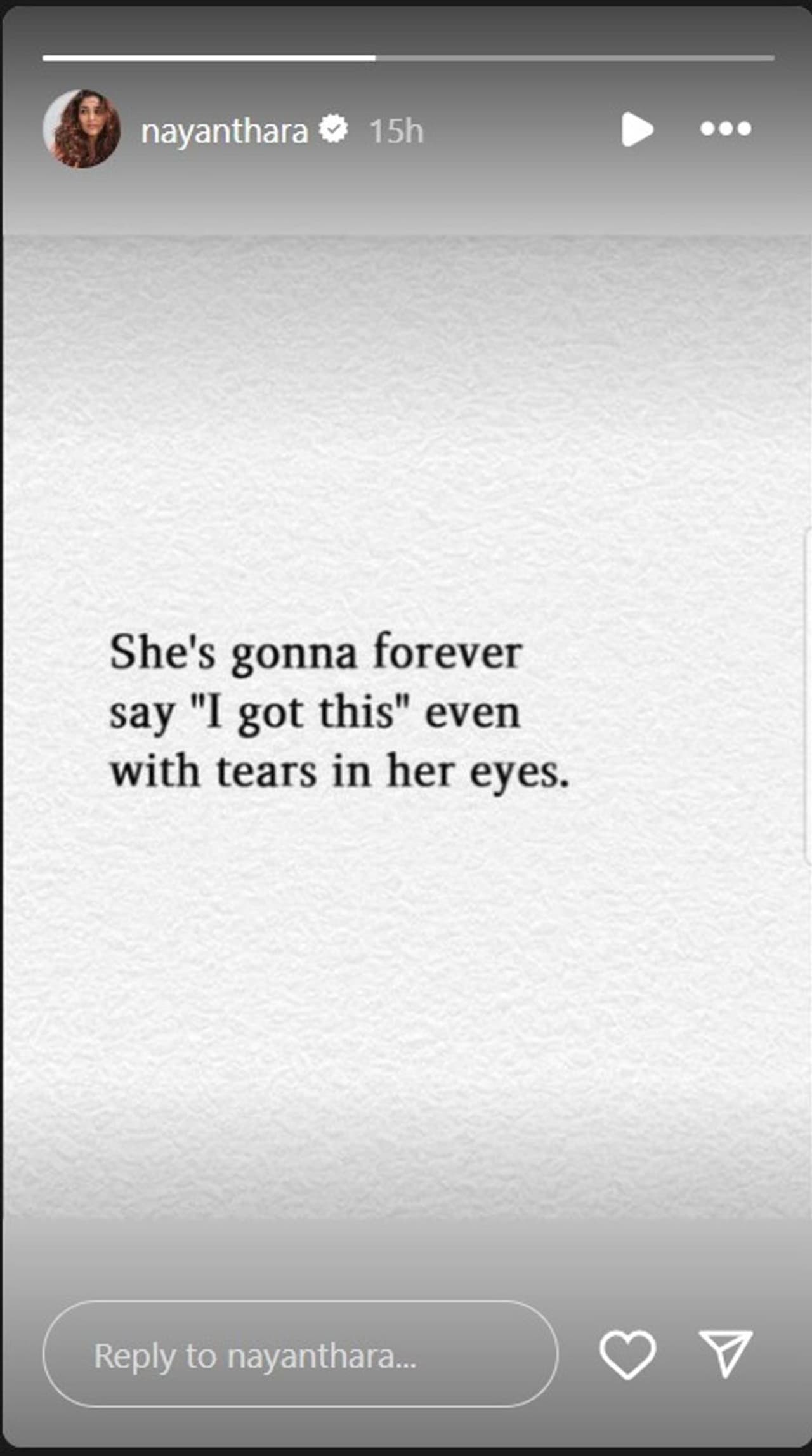 The enigmatic post featured a thought-provoking message: "She’s gonna forever say ‘I got this’ even with tears in her eyes." This cryptic statement has led to widespread speculation among fans, eager to decipher its meaning and understand its underlying emotions. Despite the apparent unfollowing on Instagram, Nayanthara's profile still features pictures of her with Vignesh Shivan. Just last week, Nayanthara shared a poignant black and white photograph on her Instagram stories, depicting her standing beside Vignesh Shivan with his arms wrapped around her. Although she refrained from adding any captions, she set the mood by attaching Prateek Kuhad’s song Kho Gaye Hum Kahan to her story, adding to the air of mystery surrounding their relationship.