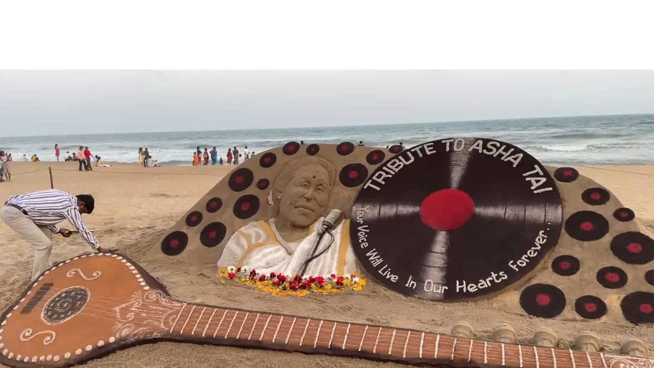 Sand artist Sudarsan Pattnaik paid tribute to singer Asha Bhosle at Puri Beach after her demise. He, along with his students, created a 20-feet-long Veena sand art with the message 'Tribute to Asha Tai, Your voice will live in our hearts forever'.