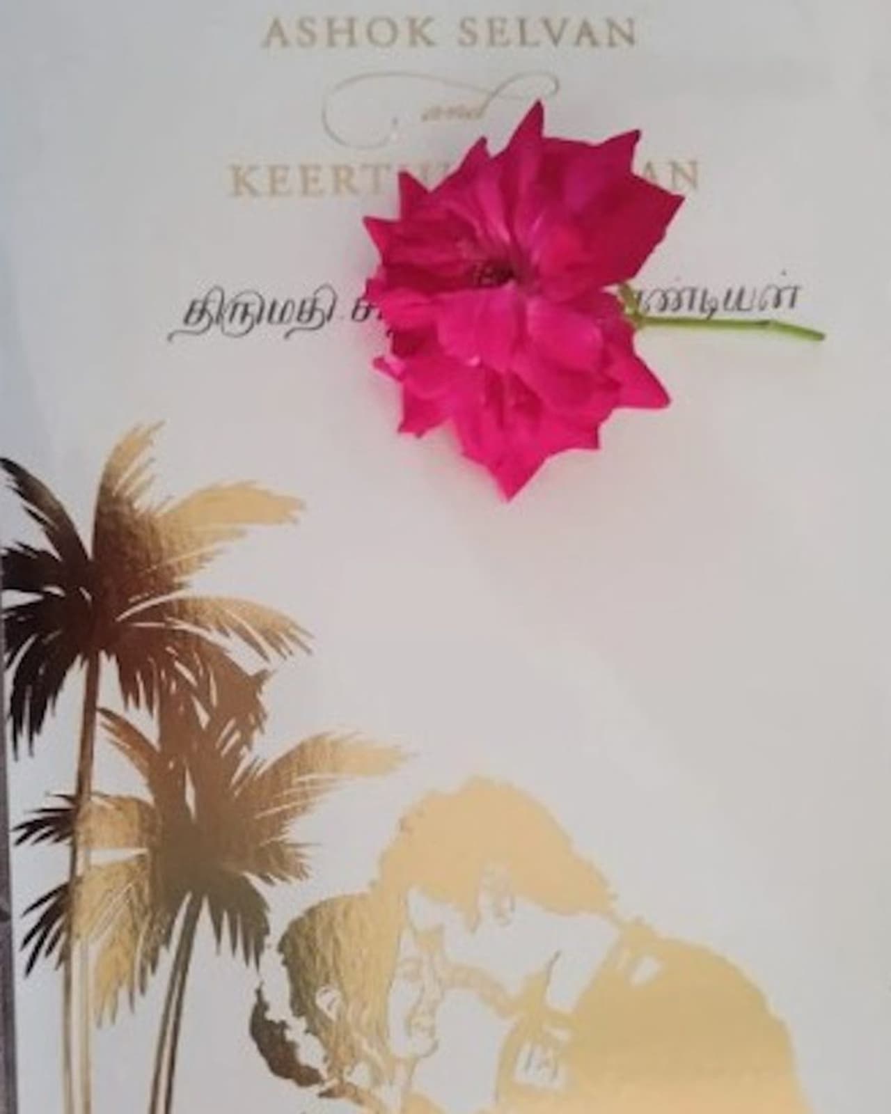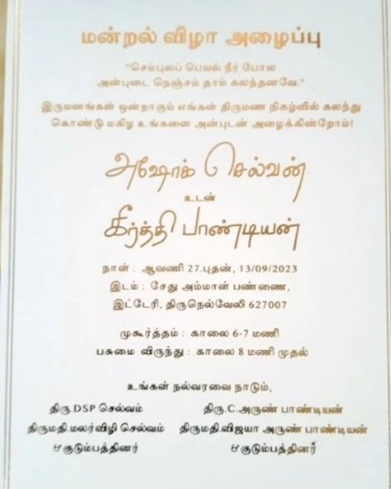 Keerthi Pandian and Ashok Selvan are going to get married on September 13. The wedding is to reportedly take place in all its grandness at Tirunelveli, Tamil Nadu. The wedding invitation for their marriage has now been leaked on social media weeks before the event. It is the talk of the town now. With the presence of their close friends and family, the couple reportedly got engaged recently as per the information.