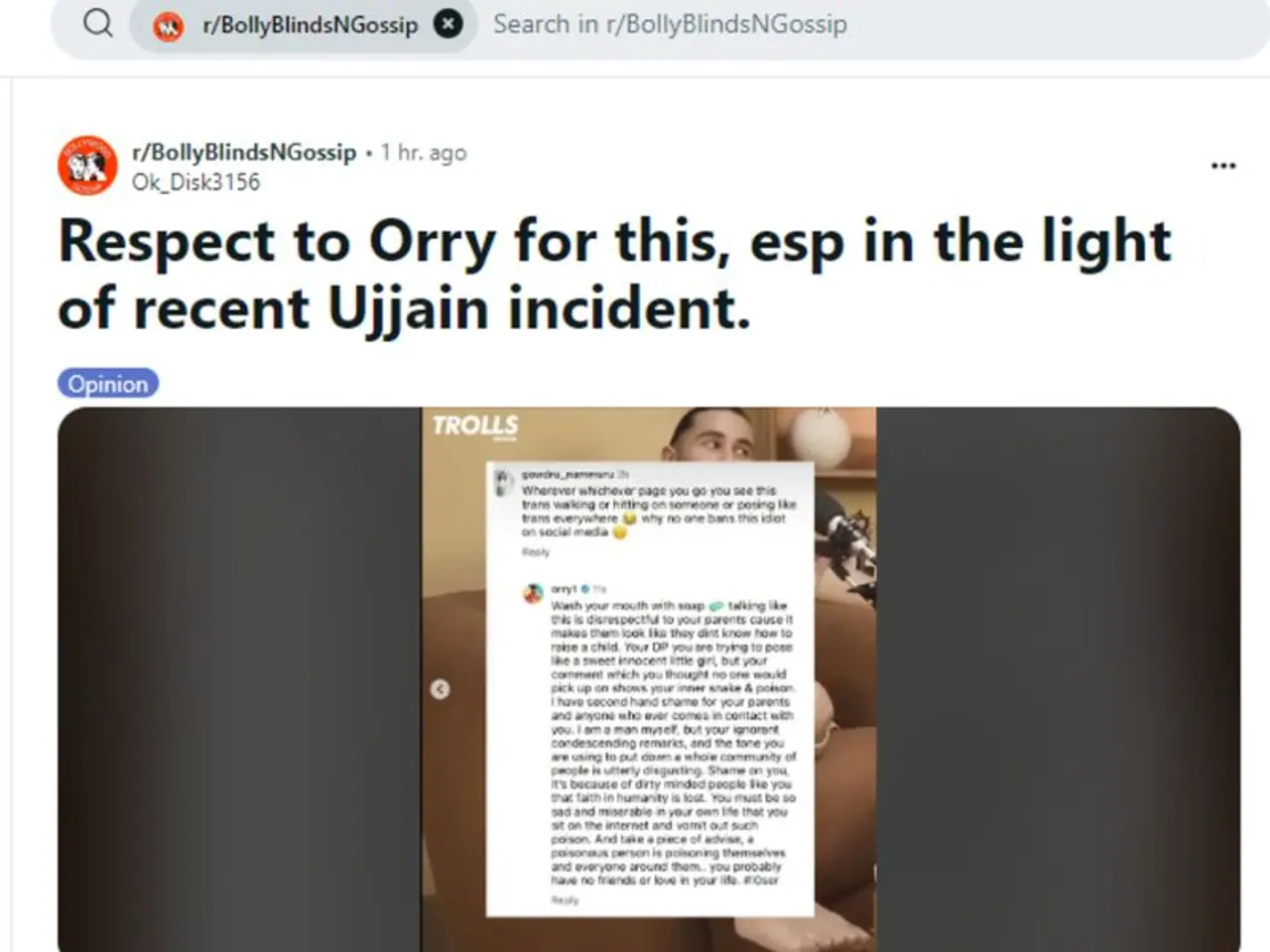 On one of his posts, the troller questioned his sexuality. “Wherever whichever page you go, see this trans walking or hitting on someone or posing like trans everywhere. Why no one bans this idiot on social media.”