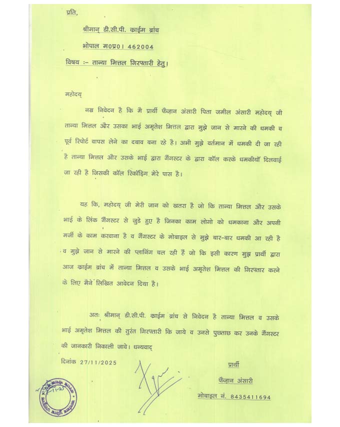 In his complaint sworn on November 27, 2025, Ansari requested the Crime Branch in Bhopal to immediately arrest Tanya and Amritesh and investigate fully into their alleged n-gangster association and their immediate intervention in his protection.