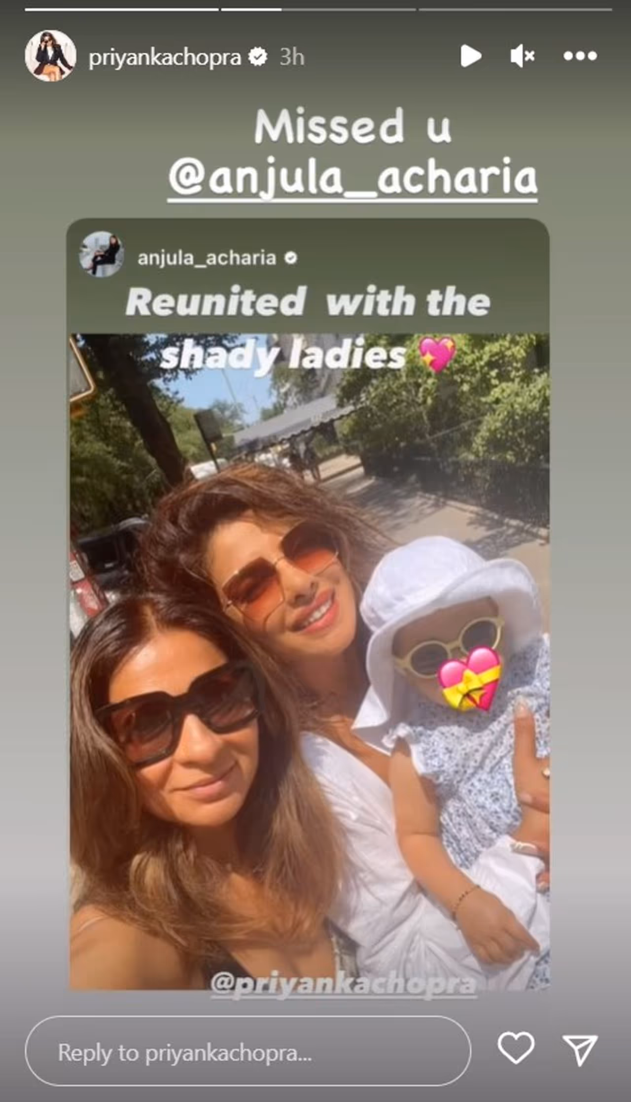 The mother-daughter team also met with Anjula Acharia, Priyanka's manager and friend. Anjula shared a photo of the three of them wearing sunglasses as they walked out on a beautiful day. Anjula captioned the photo, "Reunited with the shady ladies." PC may be seen carrying Malti, who is clad in a white gown and a white bonnet. Priyanka also reposted the snapshot on her Instagram stories, writing, ""Missed you @anjula_acharia."