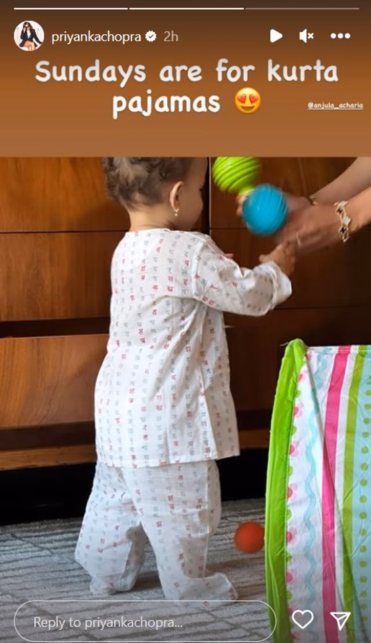 Malti may be seen in another shot standing inside a room wearing a patterned off-white kurta and pyjama with little earrings. She enjoyed playing with the toys Anjula had given her. Priyanka said, "Sundays are for kurta pyjamas (heart eye emojis)." Anjula also uploaded further photos of Malti wearing the kurta pyjama combo. In one, she can be seen sitting on the floor with toys as Anjula caressed Priyanka's dog, Diana. Anjula said, "On Massi duty!" Anjula was seen in another clip playing with Malti, who was holding toys and a bag in her hand. She captioned it "Finger puppets (smiling face with hearts emoji)."