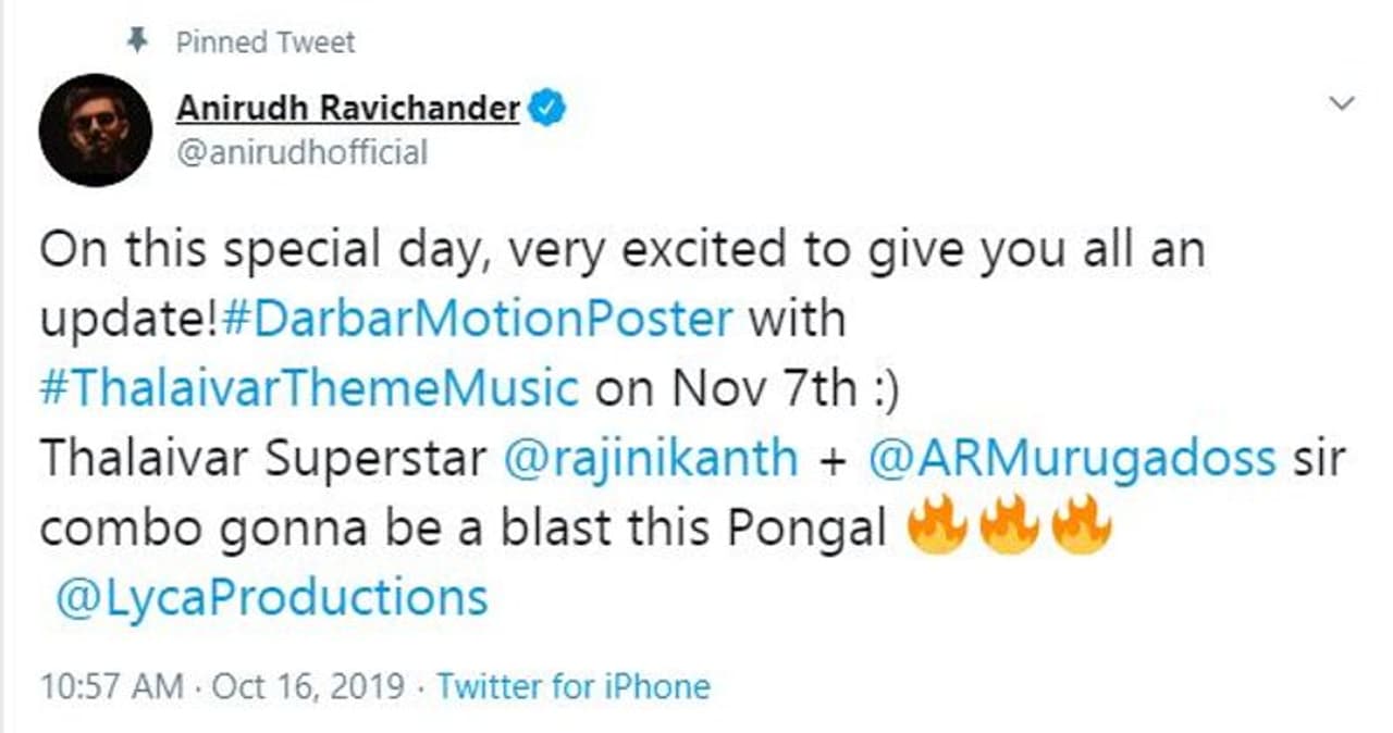 Anirudh Ravichandrer, music director of Darbar tweeted, “On this special day, very excited to give you all an update!#DarbarMotionPoster with #ThalaivarThemeMusic on Nov 7th :) Thalaivar Superstar @rajinikanth + @ARMurugadoss sir combo gonna be a blast this Pongal @LycaProductions.”
