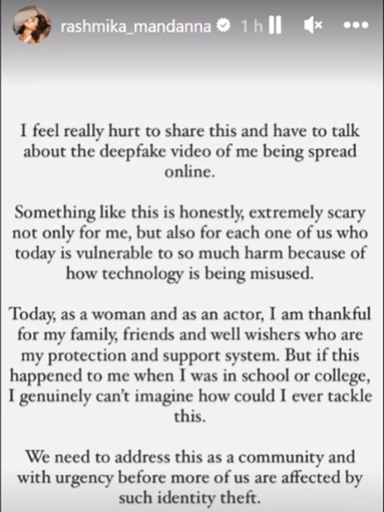 Rashmika finally spoke out on November 6 after being a victim of cybercrime. She mentioned identity theft and expressed her hurt in her statement.