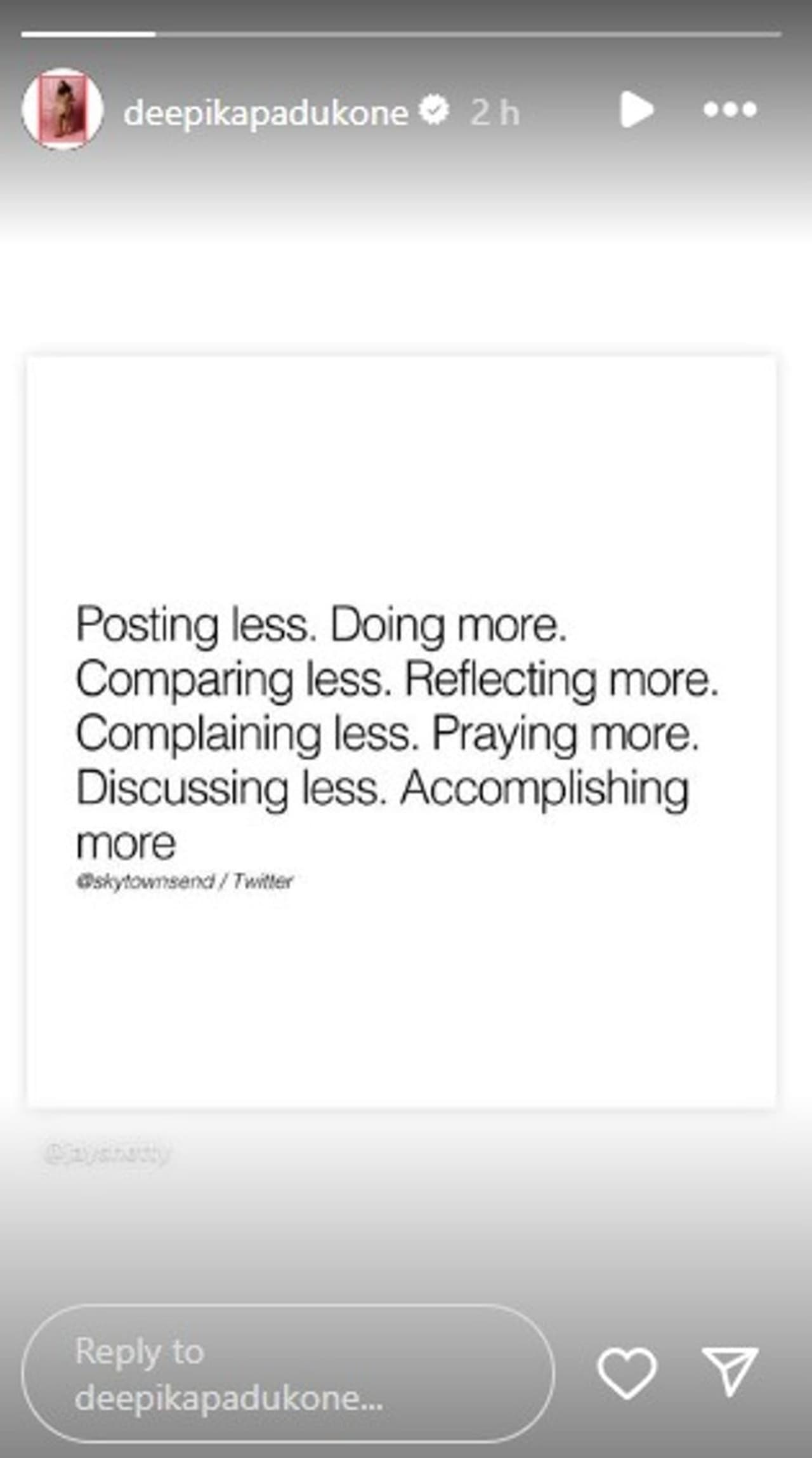 Deepika Padukone has revealed yet another enigmatic message about her pregnancy. On Saturday, the pregnant actress turned to Instagram stories to post a statement about praying more and grumbling less. “Posting less. Doing more. Comparing less. Reflecting more,” the quote read. “Complaining less. Praying more. Discussing less. Accomplishing more,” it added.