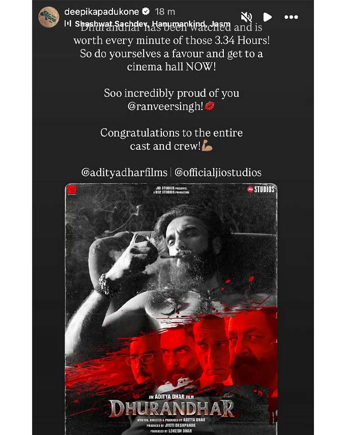 Deepika Padukone stated, "Dhurandhar has been watched and is worth every minute of those 3.34 hours! So do yourselves a favour and get to a cinema hall NOW! So incredibly proud of you @ranveersingh. Congratulations to the entire cast and crew!"