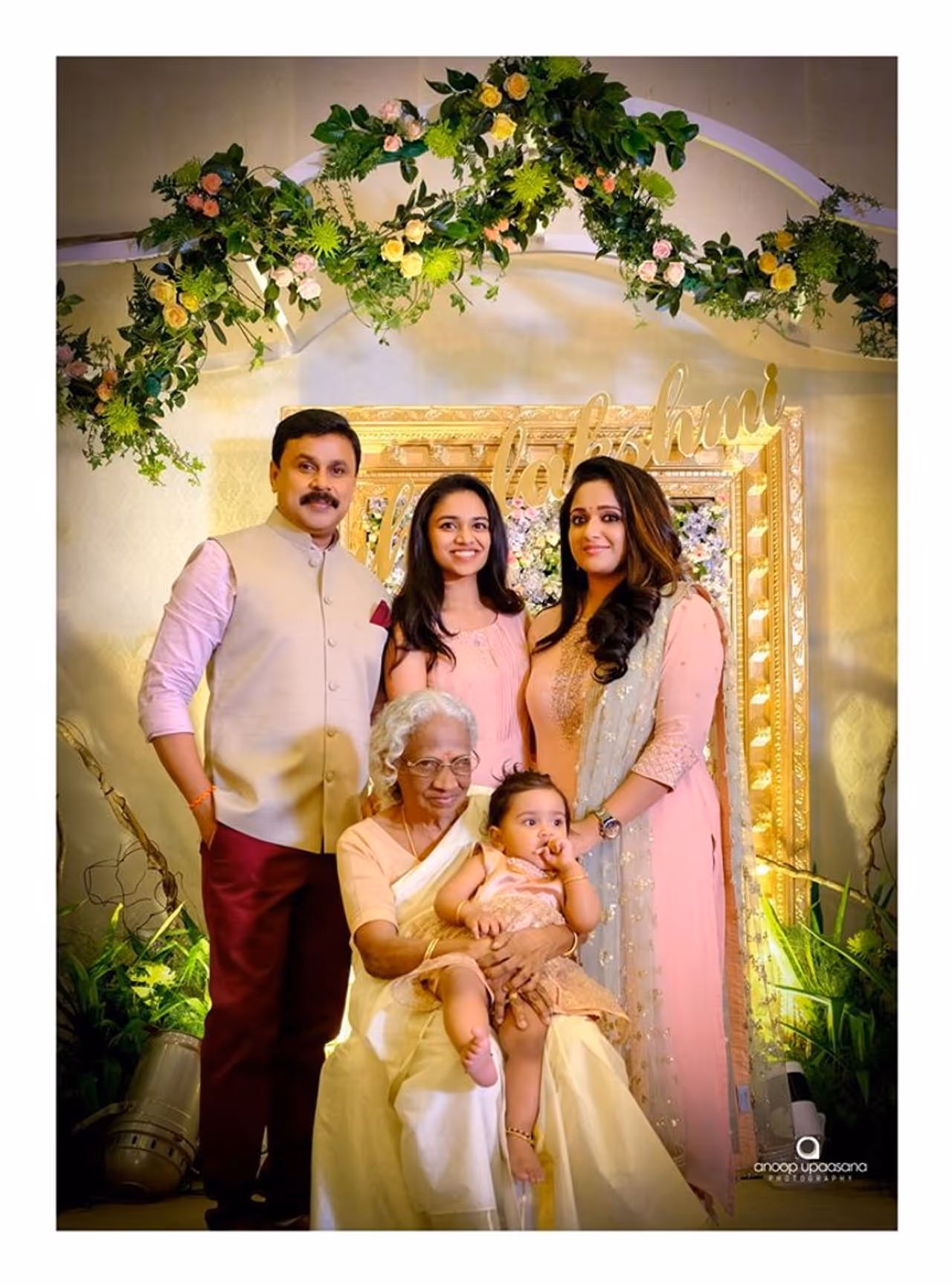 The picture of Dileep, Kavya Madhavan and Meenakshi, Mahalakshmi and Dileep's mother was taken during Mahalakshmi's first birthday celebration. Dileep could be seen in a suit vest. Kavya was donning a pink designer salwar. Meenakshi is seen in a pink dress. Mahalakshmi was seen in a golden colour frock, and Dileep's mom was seen in a traditional saree.