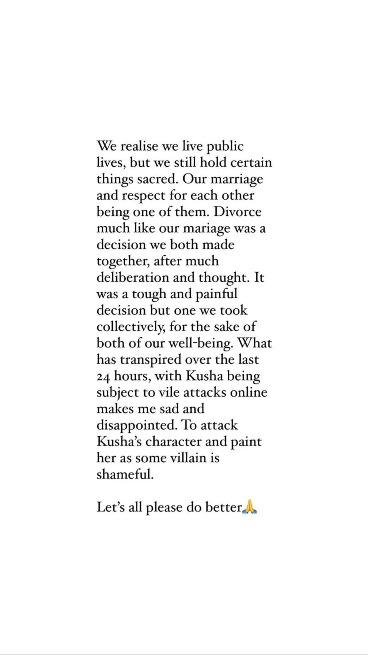 Later, taking to his Instagram Story, Zorawar expressed his side of the story and supported his ex-wife, “We realise we live public lives, but we still hold certain things sacred. Our marriage and respect for each other being one of them. Divorce much like our marriage was a decision we both made together, after much deliberation and thought. It was a tough and painful decision but one we took collectively, for the sake of both of our well-being. What has transpired over the last 24 hours, with Kusha being subject to vile attacks online makes me sad and disappointed. To attack Kusha’s character and paint her as some villain is shameful. Let’s all please do better."