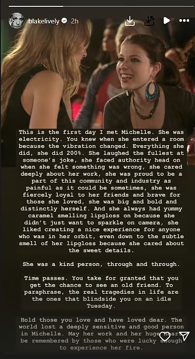Michelle's Gossip Girl co-star Blake Lively took to her Instagram handle to pen a heartbreaking note. "She was electricity. You knew when she entered a room because the vibration changed. Everything she did, she did 200%. She laughed to the fullest at someoneās joke, she faced authority head-on when she felt something was wrong, she cared deeply about her work, she was proud to be a part of this community and industry as painful as it could be sometimes, she was fiercely loyal to her friends and brave for those she loved, she was big and bold and distinctly herself. And she always had yummy caramel-smelling lip gloss because she didnāt just want to sparkle on camera, she liked creating a nice experience for anyone who was in her orbit, even down to the subtle smell of her lip gloss because she cared about the sweet details."
