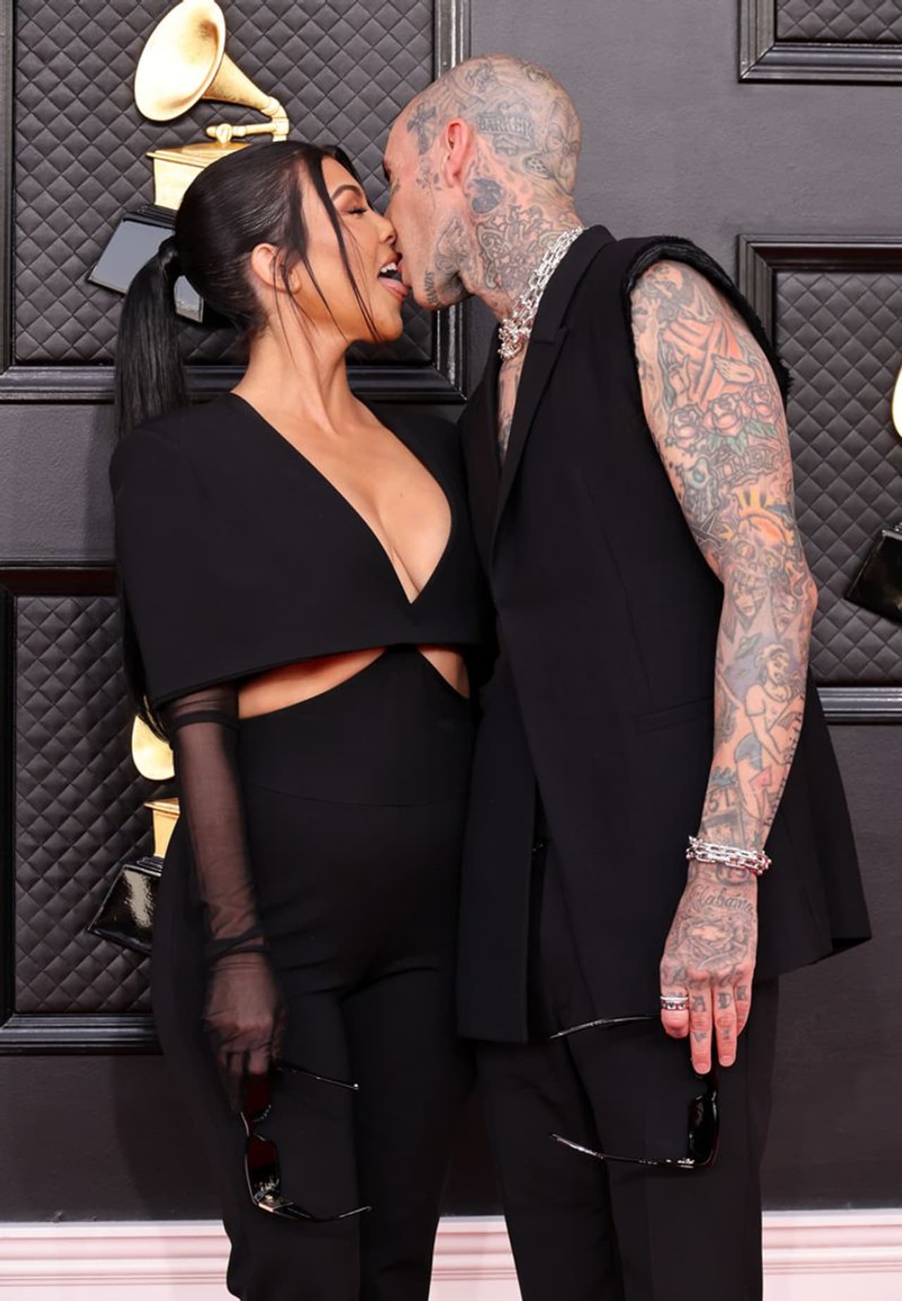 Kourtney Kardashian and Travis Barker indulged in PDA at the red carpet event of the 64th Grammy Awards 2022. The two exchanged kisses while posing for the shutterbugs.