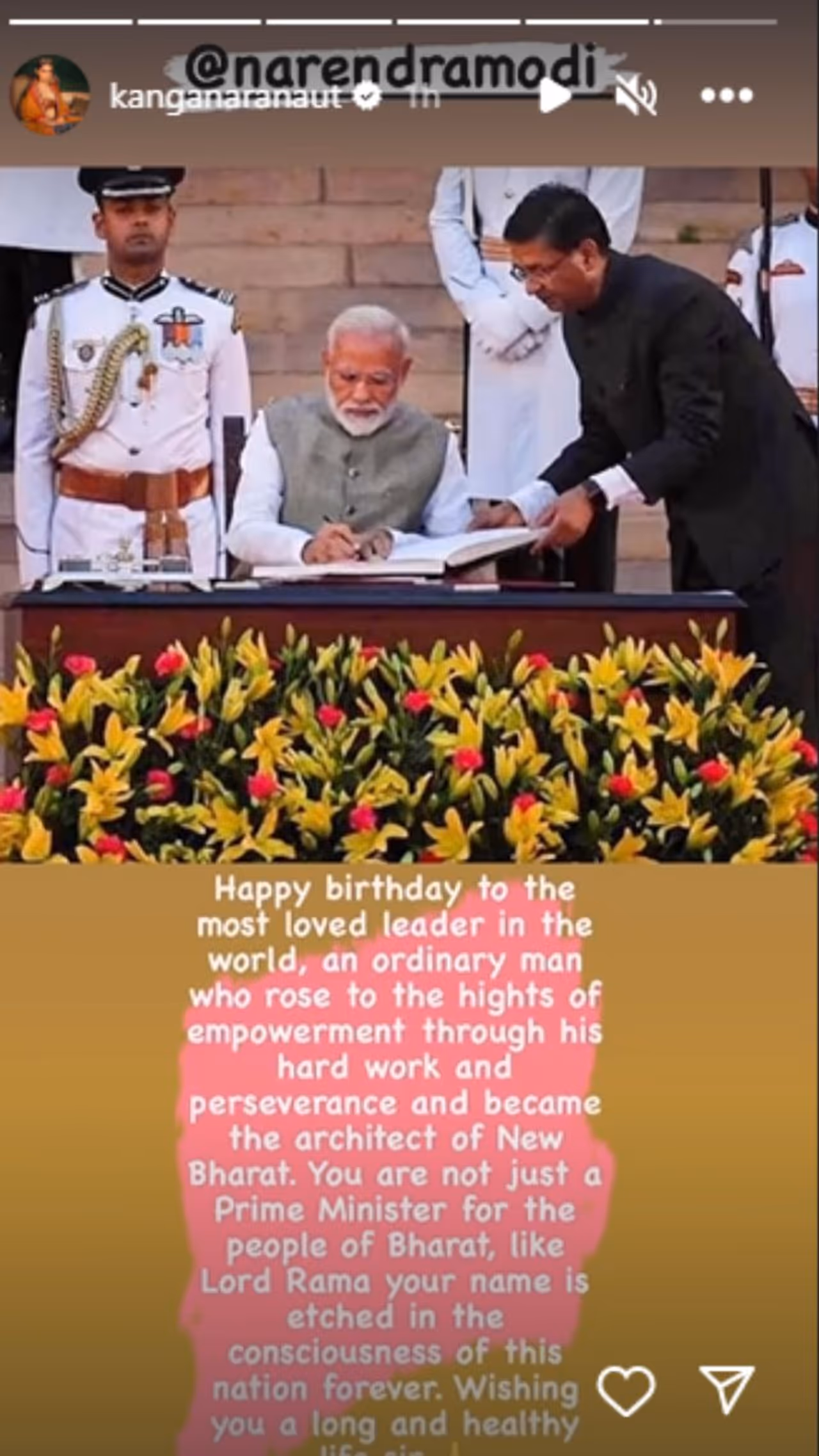 Actress Kangana Ranaut posted an emotional birthday message for Prime Minister Narendra Modi on her social media accounts on his 73rd birthday, congratulating him and referring to him as the "most loved leader in the world." “Happy birthday to the most loved leader in the world, an ordinary man who rose to the heights of empowerment through his hard work and perseverance and became the architect of New Bharat. You are not just a Prime Minister for the people of Bharat, like Lord Rama your name is etched in the consciousness of this nation forever. Wishing you a long and healthy life sir." her note read.