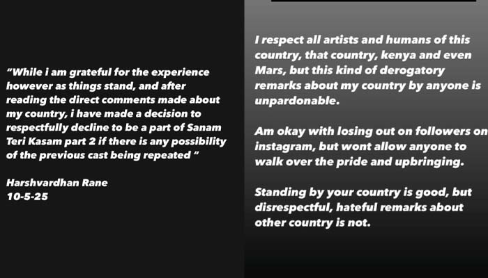 Sanam Teri Kasam actor Harshvardhan Rane, who is popular for playing the role in the film, has refused to act in the sequel if the original cast, which includes Pakistani actress Mawra Hocane, is not changed. This comes after Mawra criticized India's Operation Sindoor military action on social media.