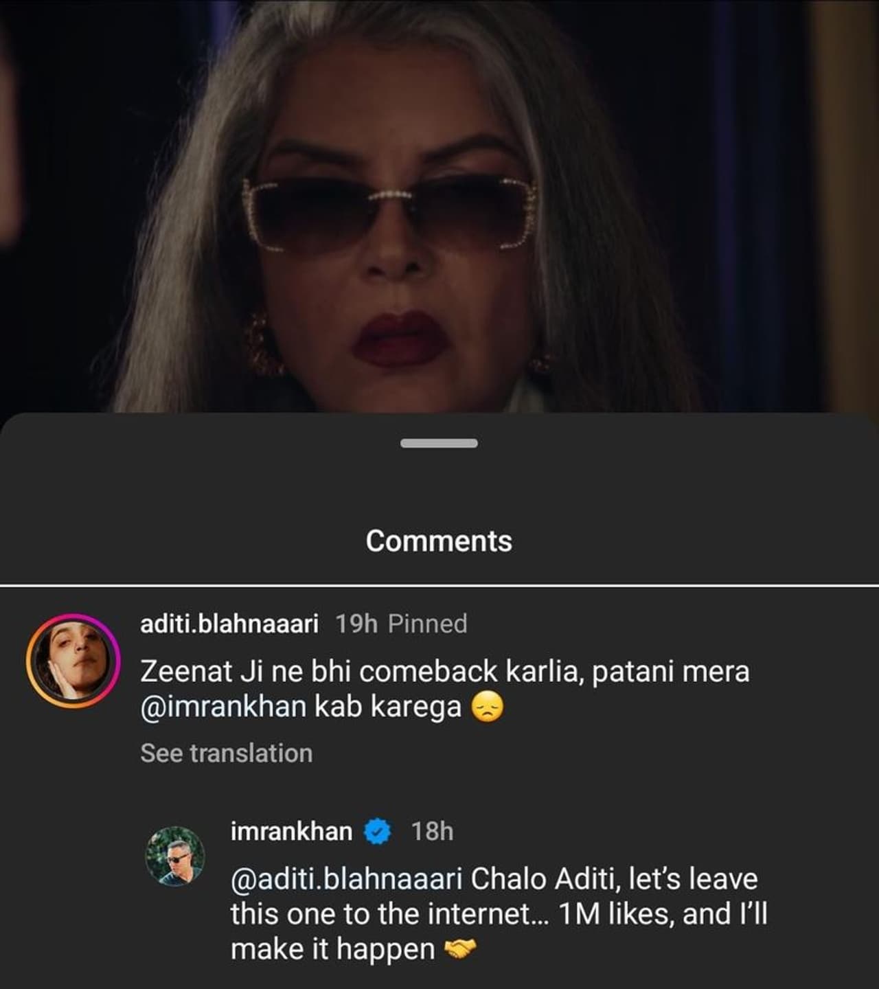 Under the comment section of veteran actress Zeenat Aman's new Instagram post, a fan requested Imran Khan to make a comeback to movies. which sparked curiosity and excitement among other fans of Imran Khan. The person wrote, “Zeenat ji ne bhi comeback karlia, patani mera @imrankhan kab karega (Even Zeenat ji made a comeback, don’t know when my Imran Khan will do so).” Imran noticed this comment and replied that he had a certain condition to heed her request. He said, “Chalo Aditi, let's leave this to the internet… 1M likes, and I'll make it happen (shake hands emoji).”