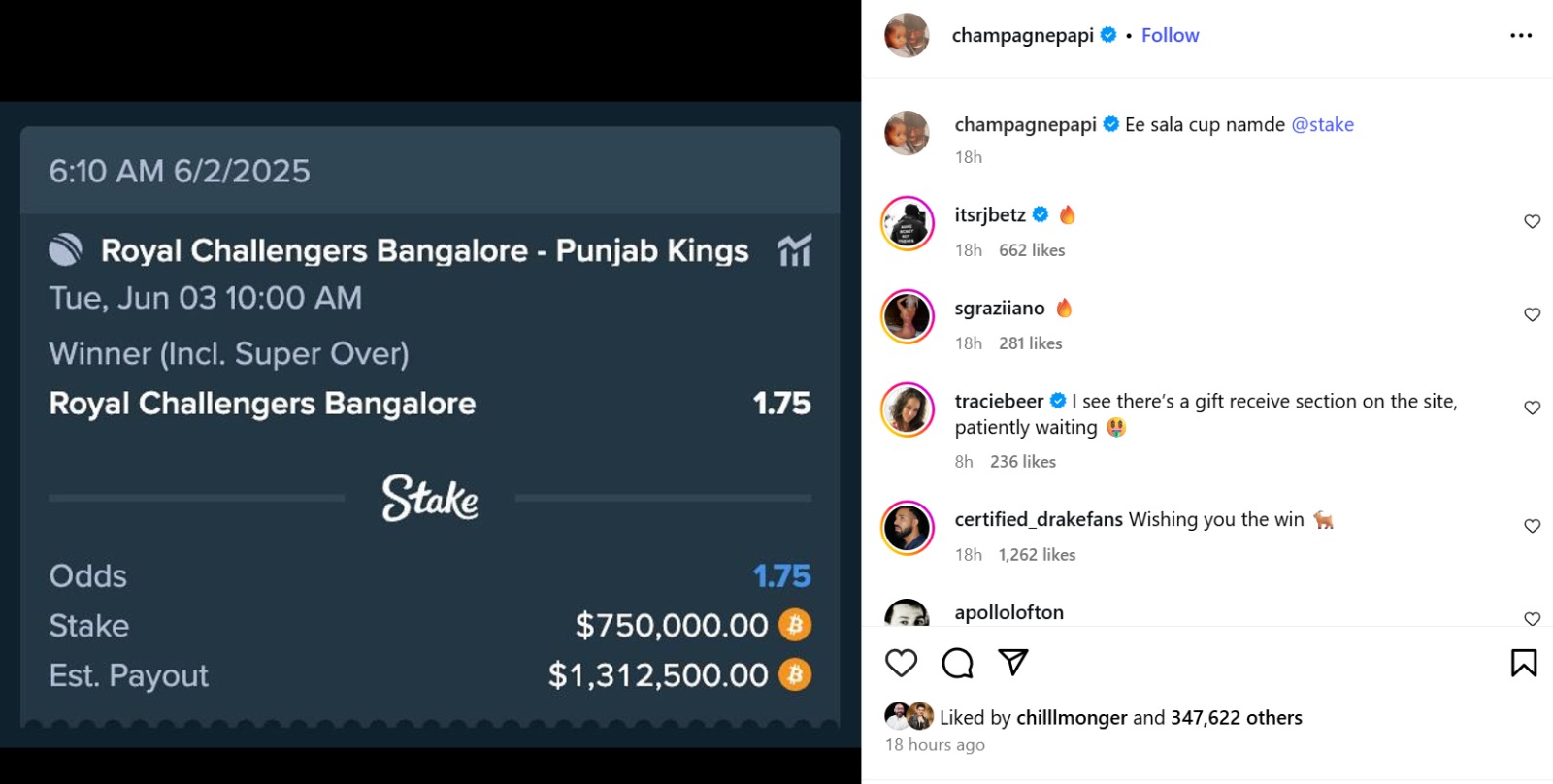 Drake shared a screenshot of the bet on his Instagram, captioned with the popular RCB slogan 'Ee sala cup namde' (Kannada for ‘this year, the cup is ours’), further igniting excitement and superstition among fans. The rapper, known globally for chart-topping hits and his deep involvement in sports betting, also tagged Stake in the post.