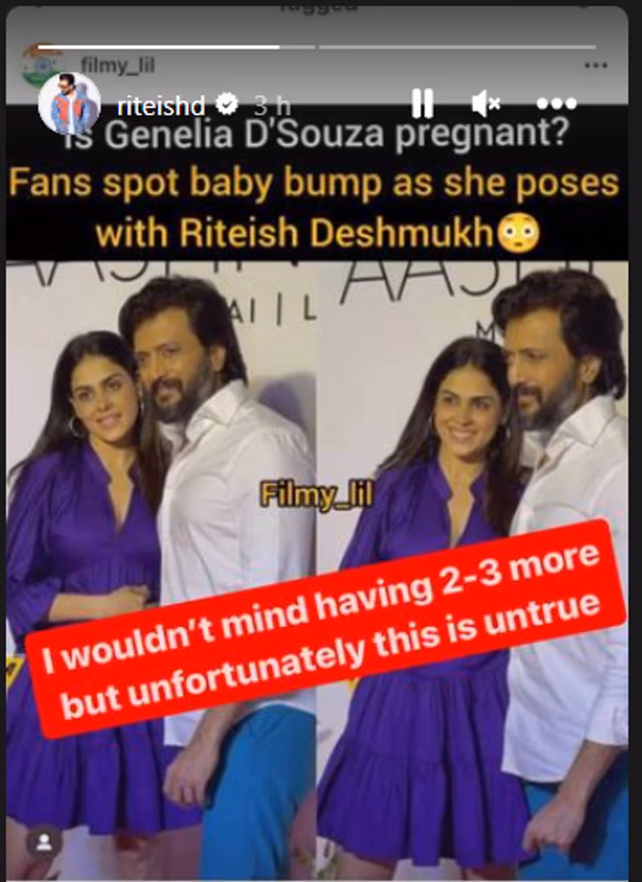 By responding to the claims, Riteish has now put an end to all the rumours. Riteish stated on his Instagram Story after posting a screenshot of a post stating Genelia was pregnant: "I wouldn't mind having 2-3 more, but unfortunately, this is untrue." Questions concerning Genelia Deshmukh's absence from films after being married to Riteish Deshmukh are frequently raised. She has frequently had to clarify that the decision to cease performing was entirely her own, contrary to widespread rumours that her husband Riteish had done so. The actress confirmed this in a recent interview as well, making it plain that she was avoiding films out of personal preference.