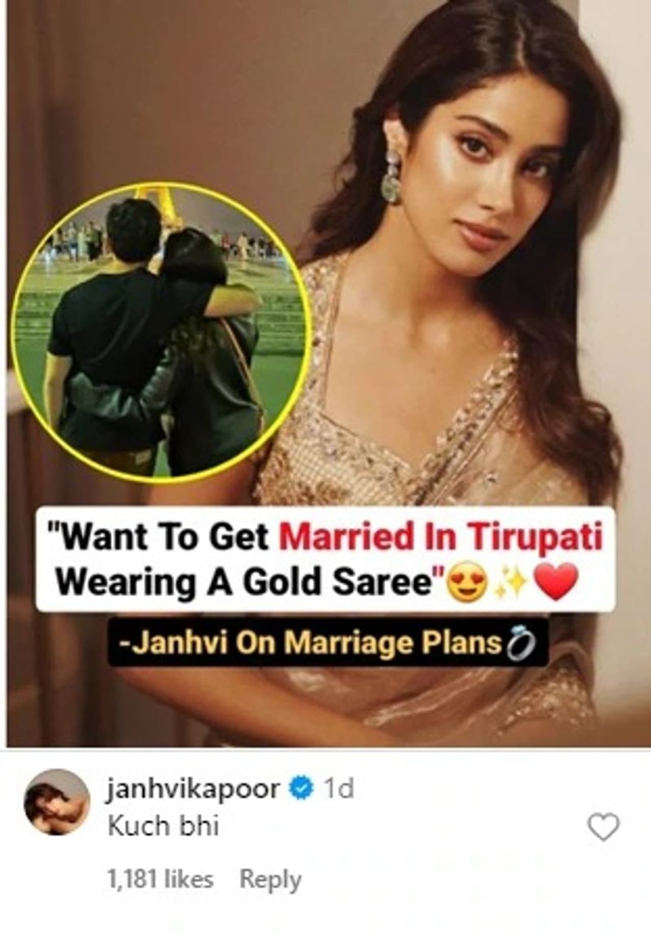 In an Instagram post, Janhvi stated, "Want to get married in Tirupati wearing a gold saree." Janhvi responded to it with a short comment, "Kuch bhi (Anything)." Her reply amused social media users. Some even quipped that Janhvi wasn't just aware of her wedding arrangements until the paparazzi arrived.