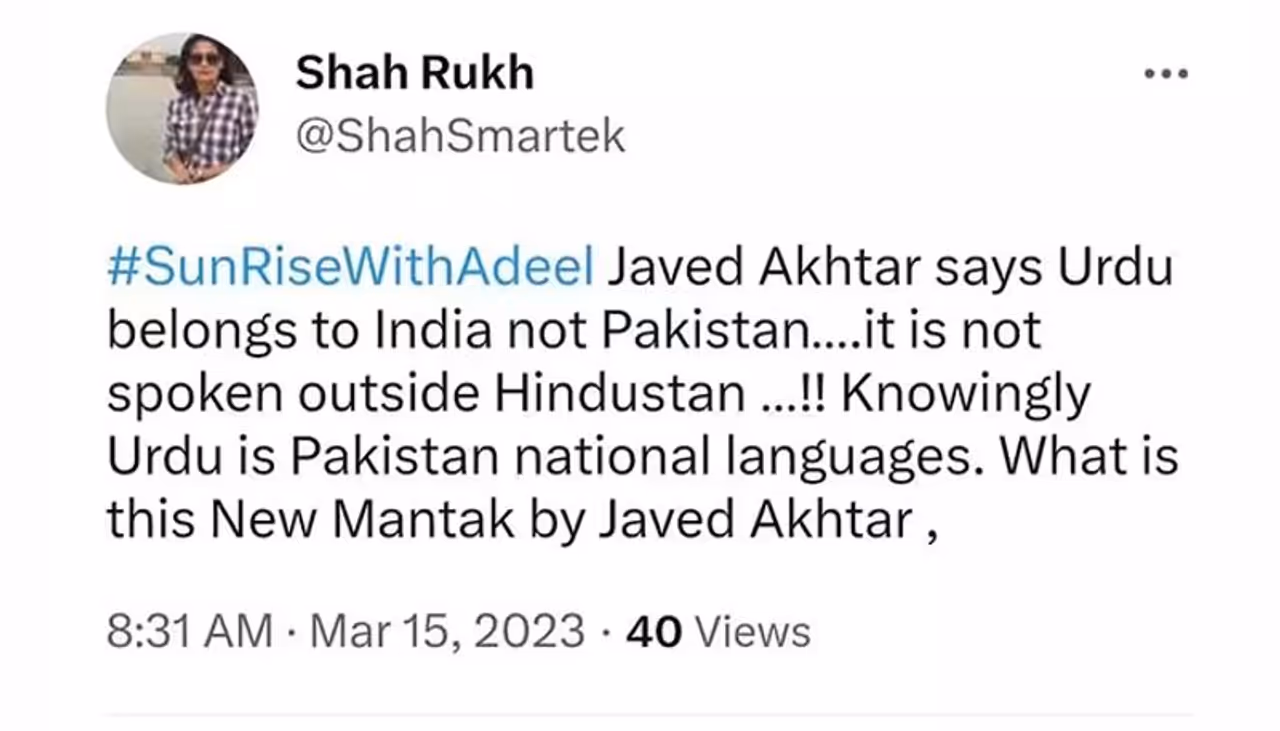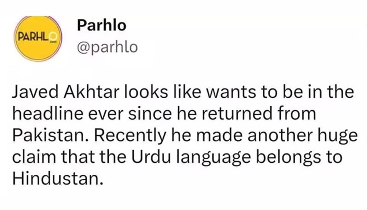 A tweet by a renowned Pakistani publication read, "Javed Akhtar looks like wants to be in headline since he returned from Pakistan. Recently he made another huge claim that Urdu language belongs to Hindustan."