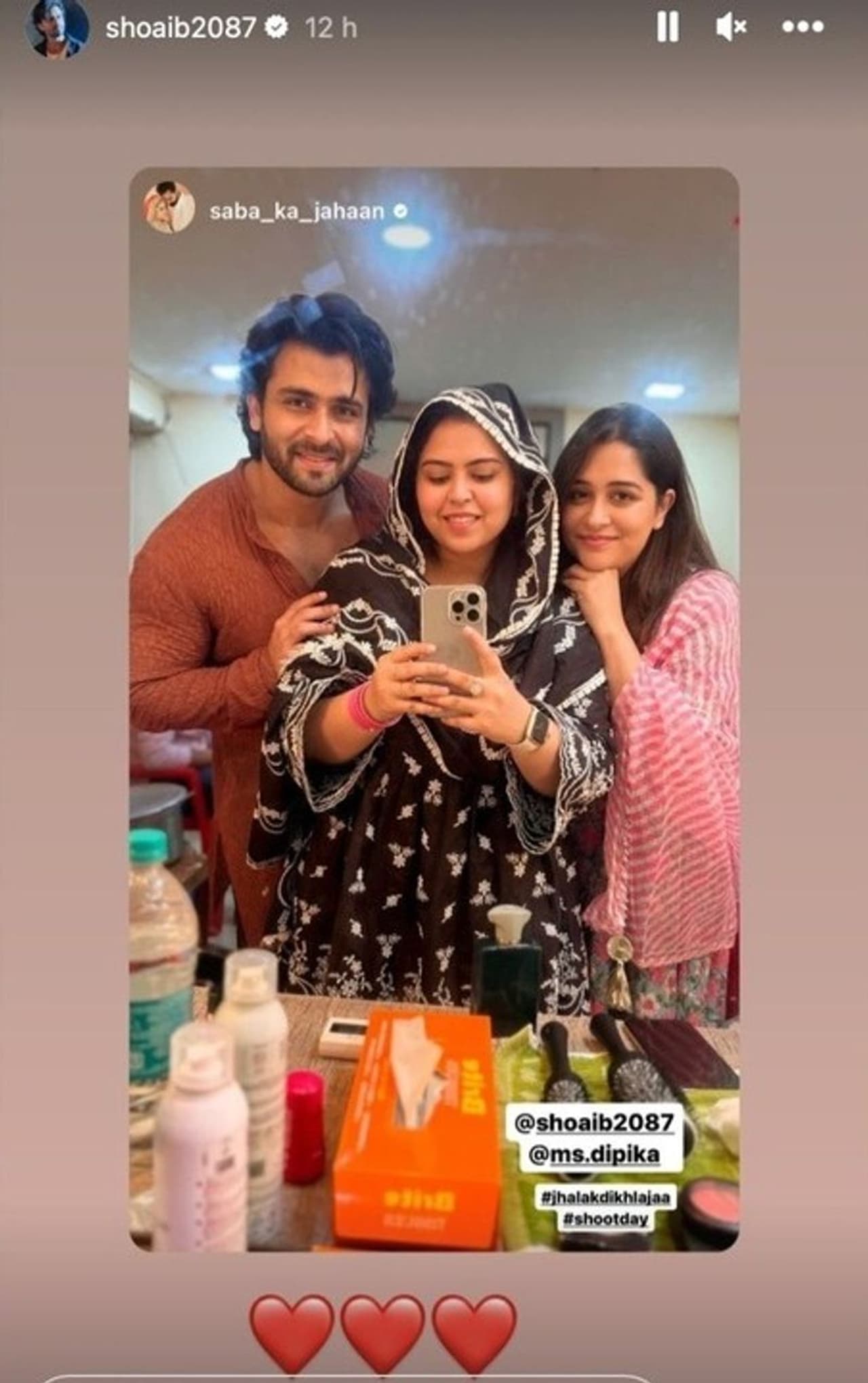 Shoaib Ibrahim re-shared a picture with his sister Saba Ibrahim and ladylove Dipika Kakar on his Instagram stories with love emoticons. Saba shared it first, using the hashtags 'JhalakDikhhlaJaadiaries' and'shootday' while publishing the photo.