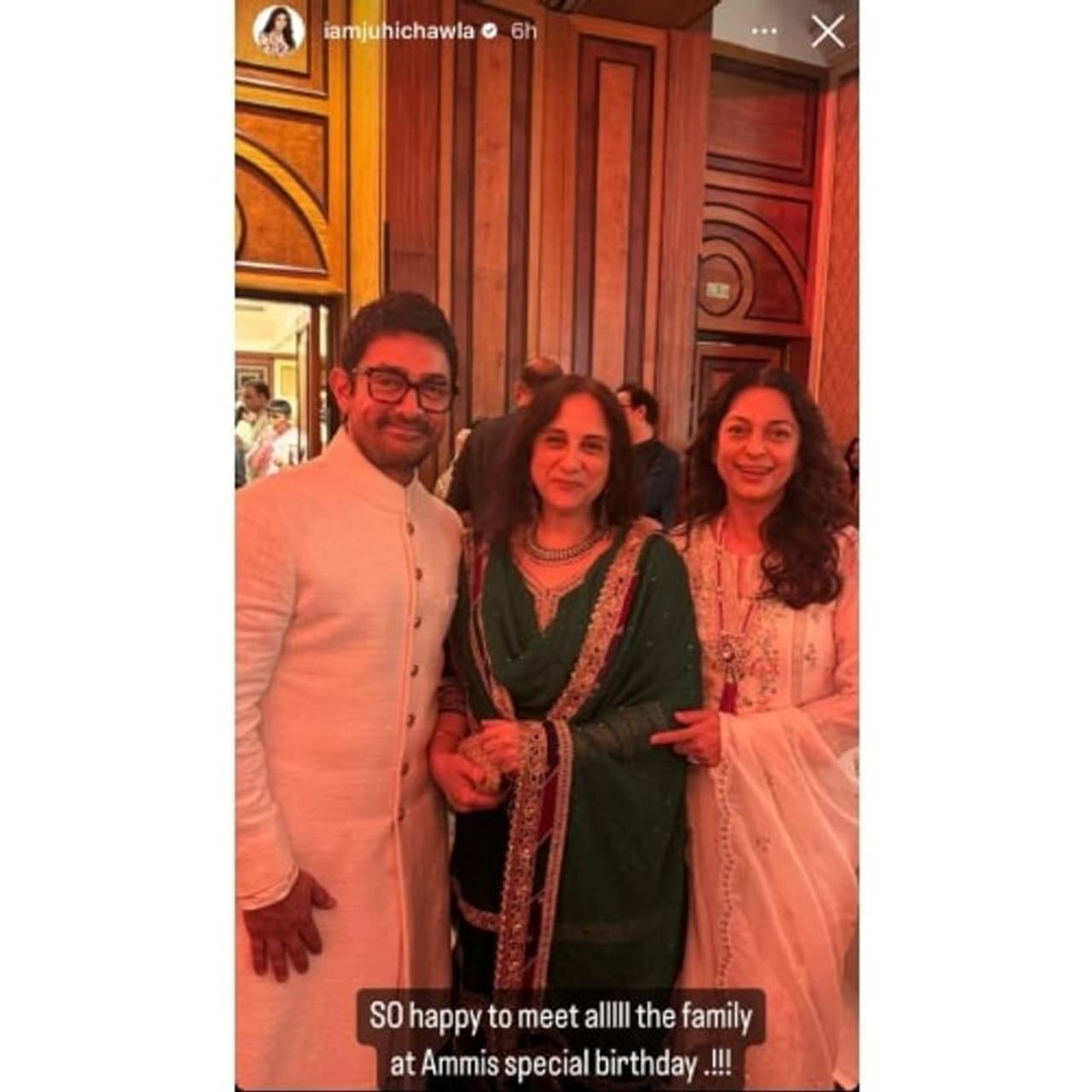 Aamir Khan celebrated his mother, Zeenat Hussain’s 90th birthday on June 13 with a grand bash at his Mumbai residence. The event saw nearly 200 family members and friends, including actress Juhi Chawla, attending. Juhi shared a heartfelt photo from the party, capturing moments with Aamir and his sister Farhat