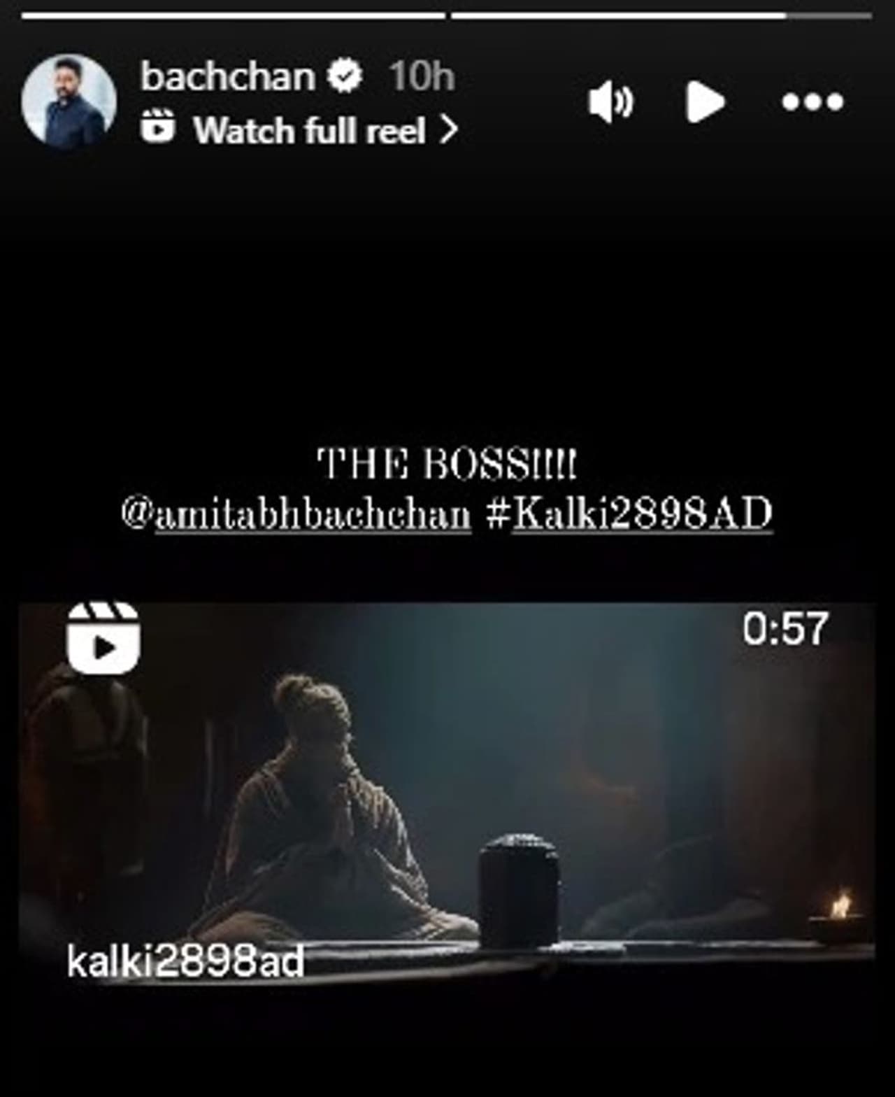 Abhishek reposted Big B's outfit from 'Kalki 2898 AD' on his Instagram story, along with the twinkle-eyed emoji. He also reshared the trailer showcasing Amitabh Bachchan's role in the film and tagged it, "THE BOSS!!!!" Abhishek also dropped fire emojis in the comments section of Amitabh's post.