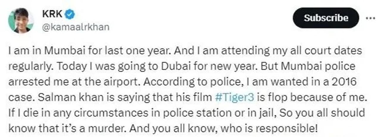 I am in Mumbai for last one year. And I am attending my all court dates regularly. Today I was going to Dubai for new year. But Mumbai police arrested me at the airport. According to police, I am wanted in a 2016 case. Salman khan is saying that his film #Tiger3 is flop because…— KRK (@kamaalrkhan) December 25, 2023