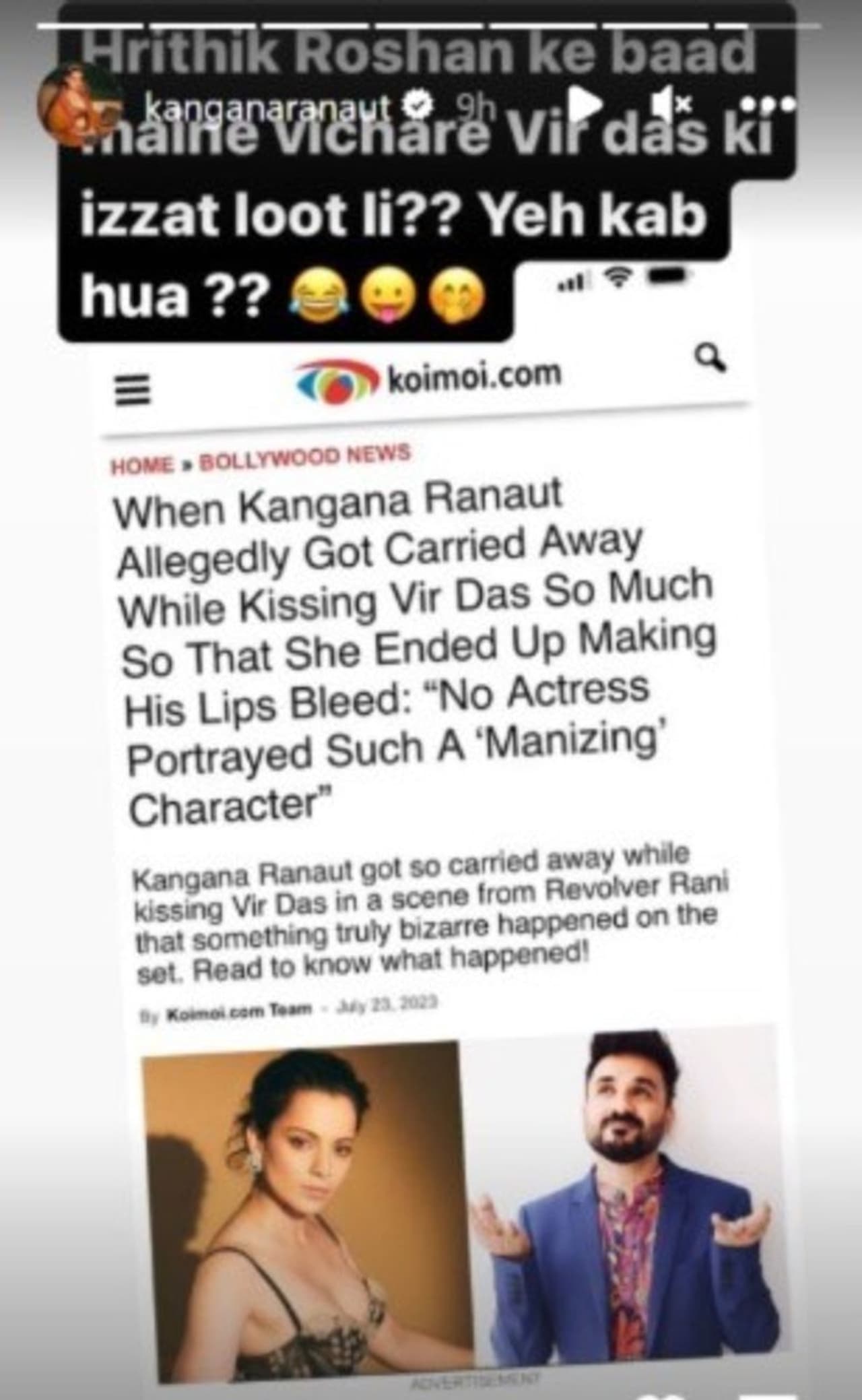 Kangana Ranaut has made headlines once more following a charge that she kissed Vir Das too passionately in a scene from the movie Revolver Rani. Finally responding to a report is the actress. She addressed the rumours on her social media accounts and talked about Hrithik Roshan as well. After Hrithik Roshan, I attacked poor Vir Das, so why don't you tell me," Kangana stated on her official Instagram stories. When did that happen? Yeh kab hua. She even distributed the report's screenshot. Speaking of Revolver Rani, Sai Kabir wrote and directed the movie starring Kangana and Vir. Along with others, it features Piyush Mishra, Zakir Hussain, and Pankaj Saraswat.