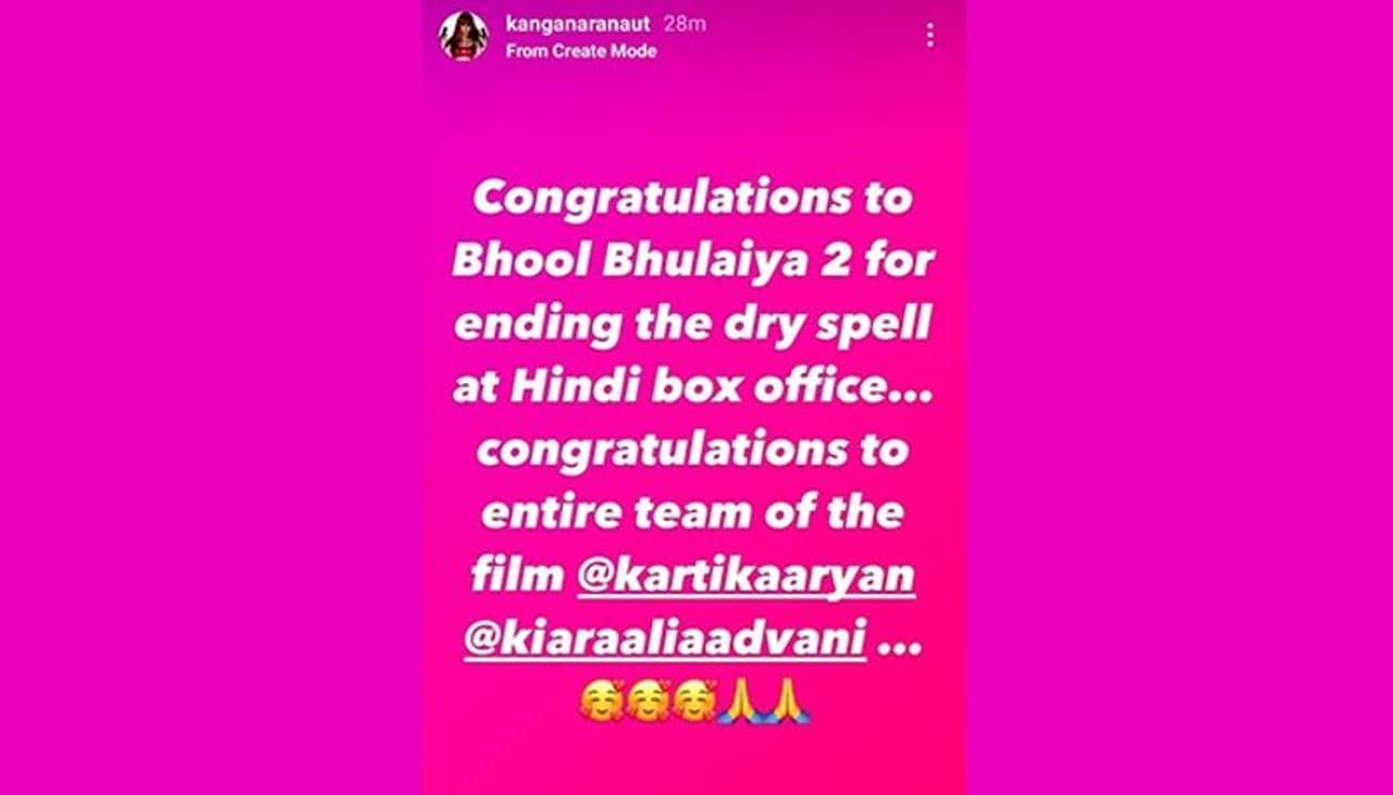 Taking to Instagram, Kangana Ranaut, tagging Kartik Aaryan and Kiara Advani in her insta story, wrote: “Congratulations to Bhool Bhulaiyaa 2 for ending the dry spell at Hindi box office.. Congratulations to the entire team of the film.” Check out her post here: