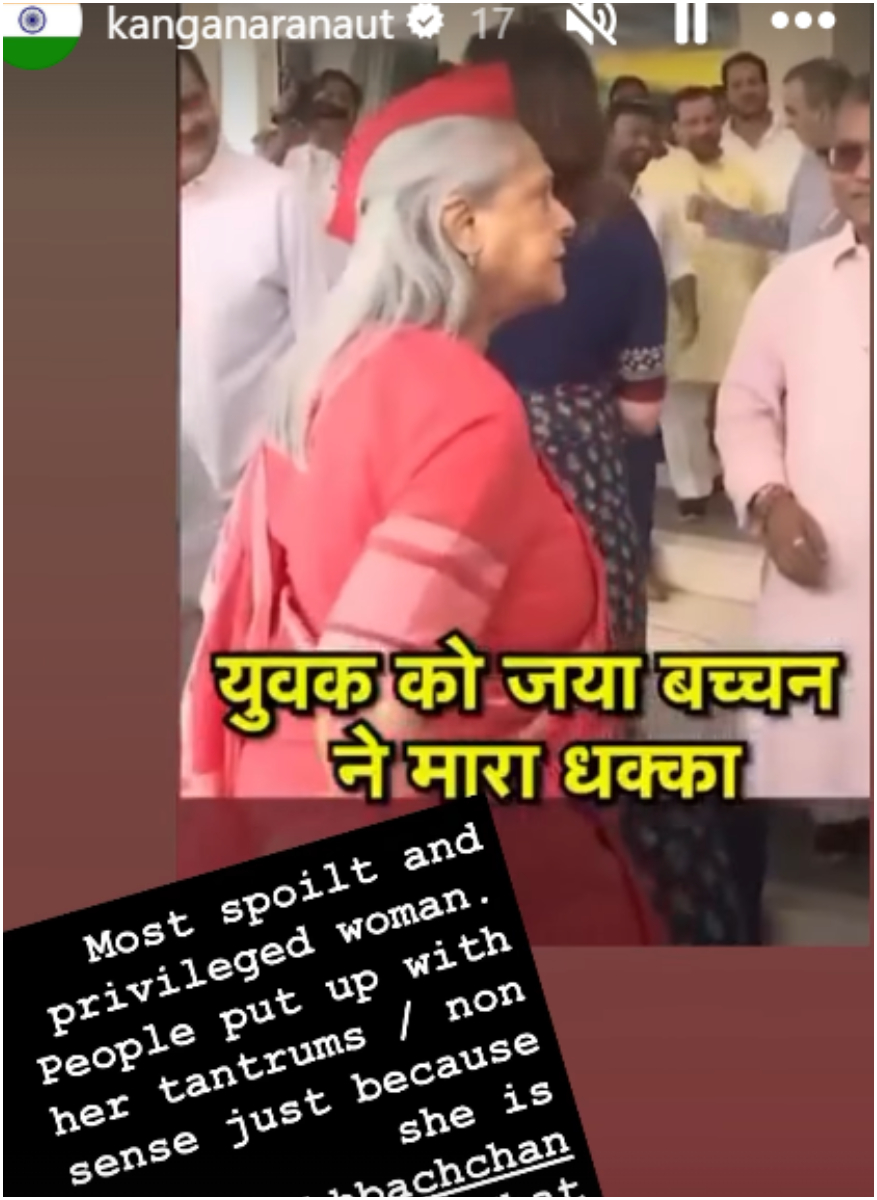 Shortly after the footage began circulating online, Kangana Ranaut shared a pointed message on her Instagram stories. She alleged that Jaya Bachchan was “spoilt” and “privileged,” claiming people tolerated her behaviour only because she was married to Amitabh Bachchan. Kangana further remarked that the Samajwadi Party cap resembled a rooster’s comb and likened Bachchan’s demeanour to that of a “fighting cock,” describing the incident as a source of disgrace and shame.