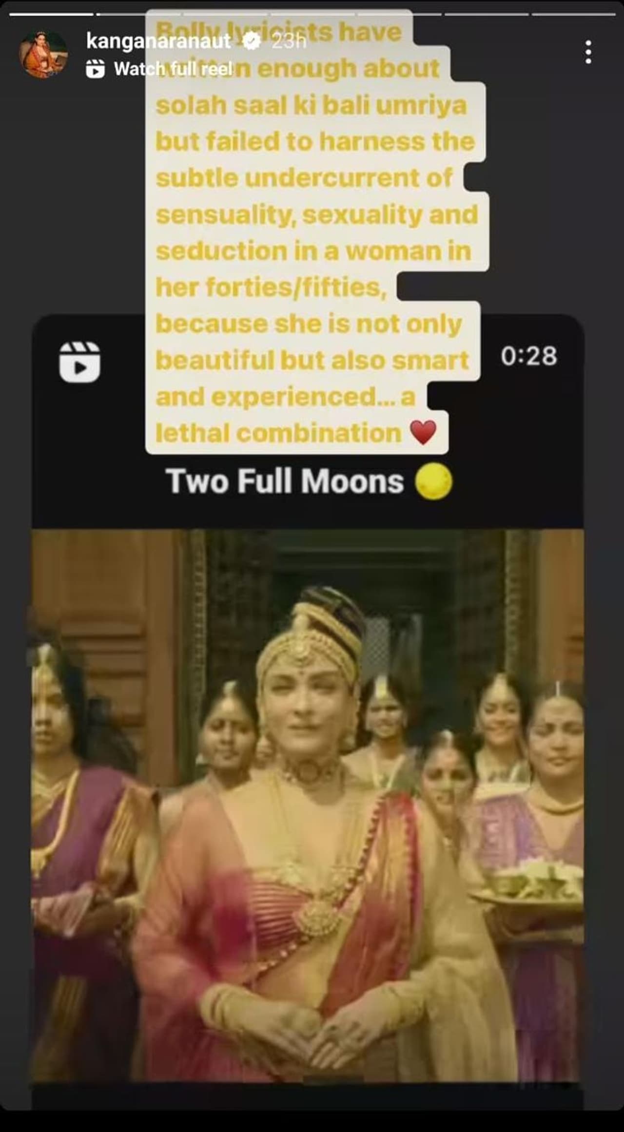 Kangana stated, "Bollywood lyricists have penned countless verses about the beauty of sixteen, but they have overlooked the subtle undercurrent of sensuality, sexuality, and seduction in a woman in her forties/fifties. Such women are not just beautiful but also intelligent and experienced—a deadly combination. Two full moons."