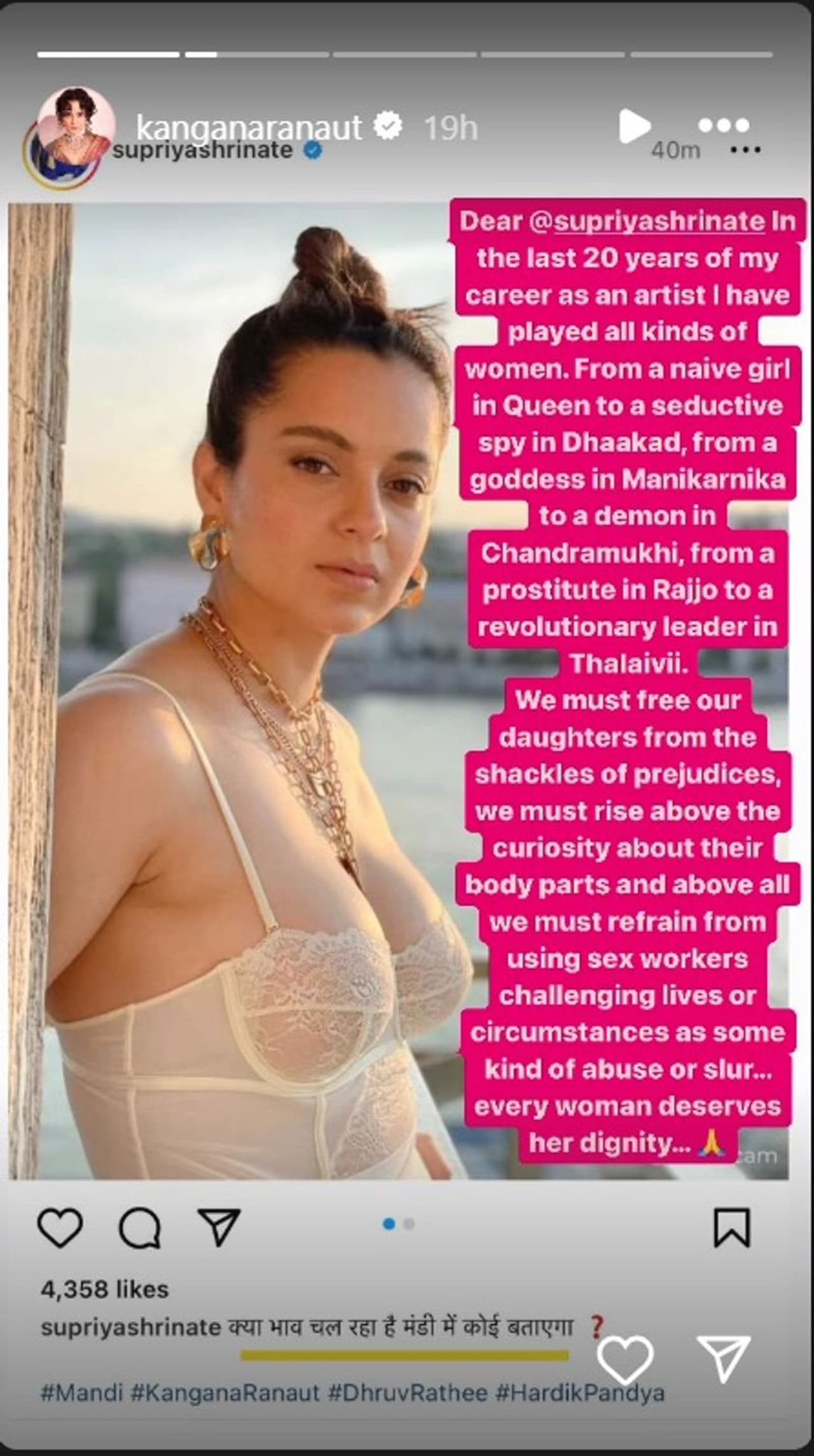 Kangana Ranaut has responded to politician Supriya Shrinate's disgusting comments which she had posted a narrative that was highly offensive and degrading. Later, she erased it. Kangana Ranaut reacted to X, saying the comment was disrespectful and that people should cease using prostitution-related phrases as slurs or abuses.