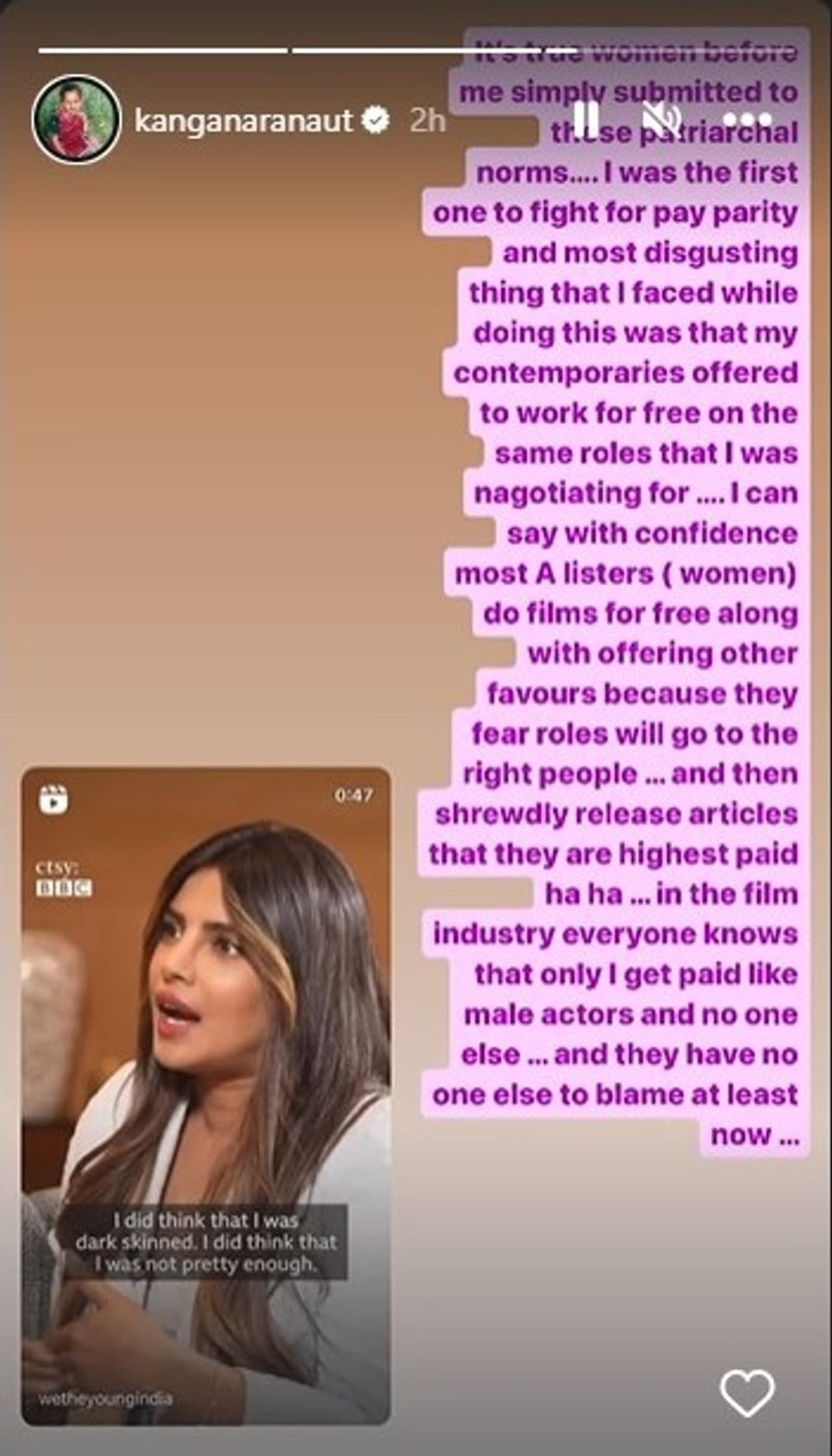 Kangana shared a video of Priyanka Chopra discussing pay inequality in Bollywood on her Instagram Stories. Even after appearing in over 60 films, Priyanka revealed in the brief footage that she "never had pay parity in Bollywood." Additionally, she disclosed that her pay was only around 10% of what the male performer would receive. Kangana added a comment to the caption explaining her viewpoint on the situation.