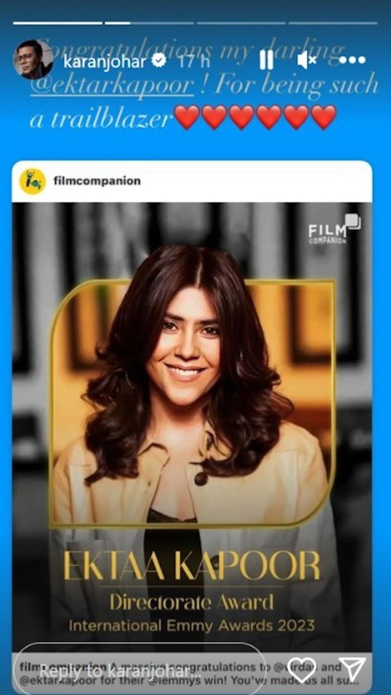 Reposting the video on his Instagram story, Karan Johar commended Ekta Kapoor's speech with a simple yet impactful message, "Solid speech."