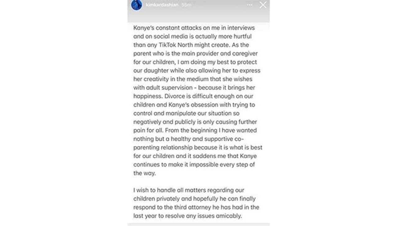Kim Kardashian also took to Instagram to put out her statement. In her statement, she wrote: “Kanye’s constant attacks on me in interviews and on social media is actually more hurtful than any TikTok North might create.”