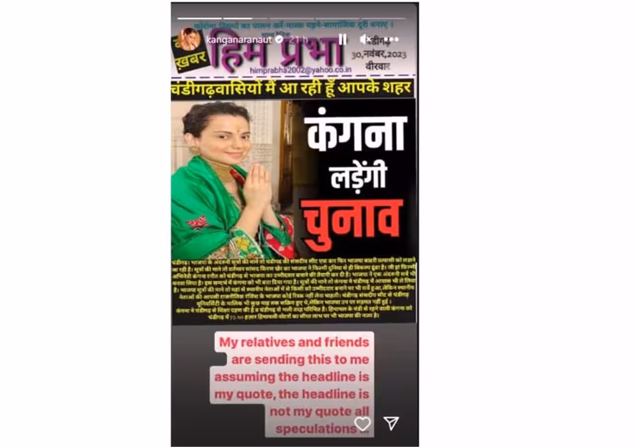 Kangana Ranaut has stated that suggestions about her running for Lok Sabha in 2024 are only speculative. She turned to Instagram stories to publish news claiming that Kangana Ranaut is being considered by a political party to replace Kirron Kher and run in the Chandigarh elections.