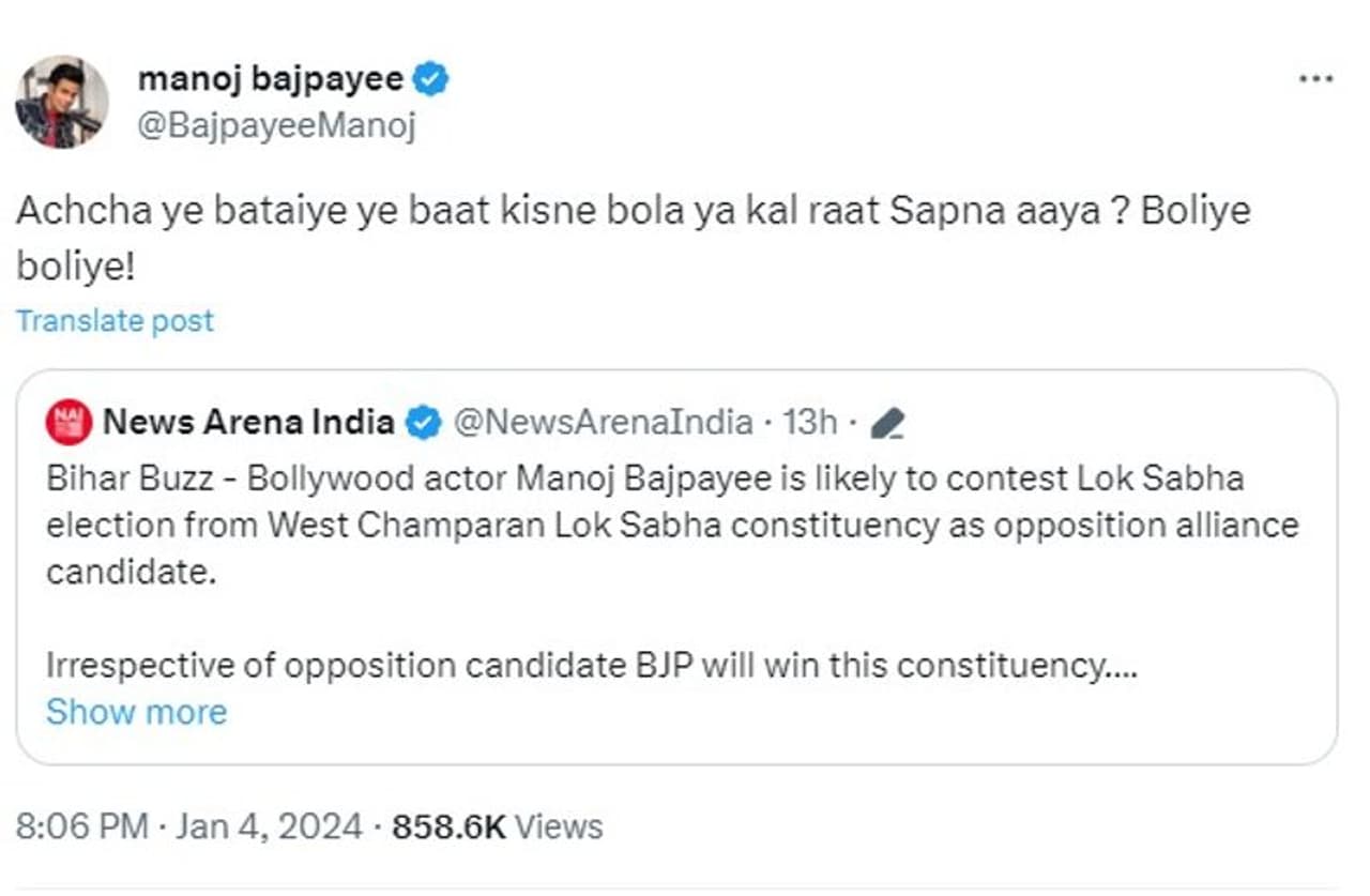 Actor Manoj Bajpayee has responded to news that he may enter politics and run in the 2024 Lok Sabha election. On Thursday, a news source reported that Manoj was planning to run for Lok Sabha from Bihar's West Champaran district. The post quickly went viral, catching Manoj's notice.