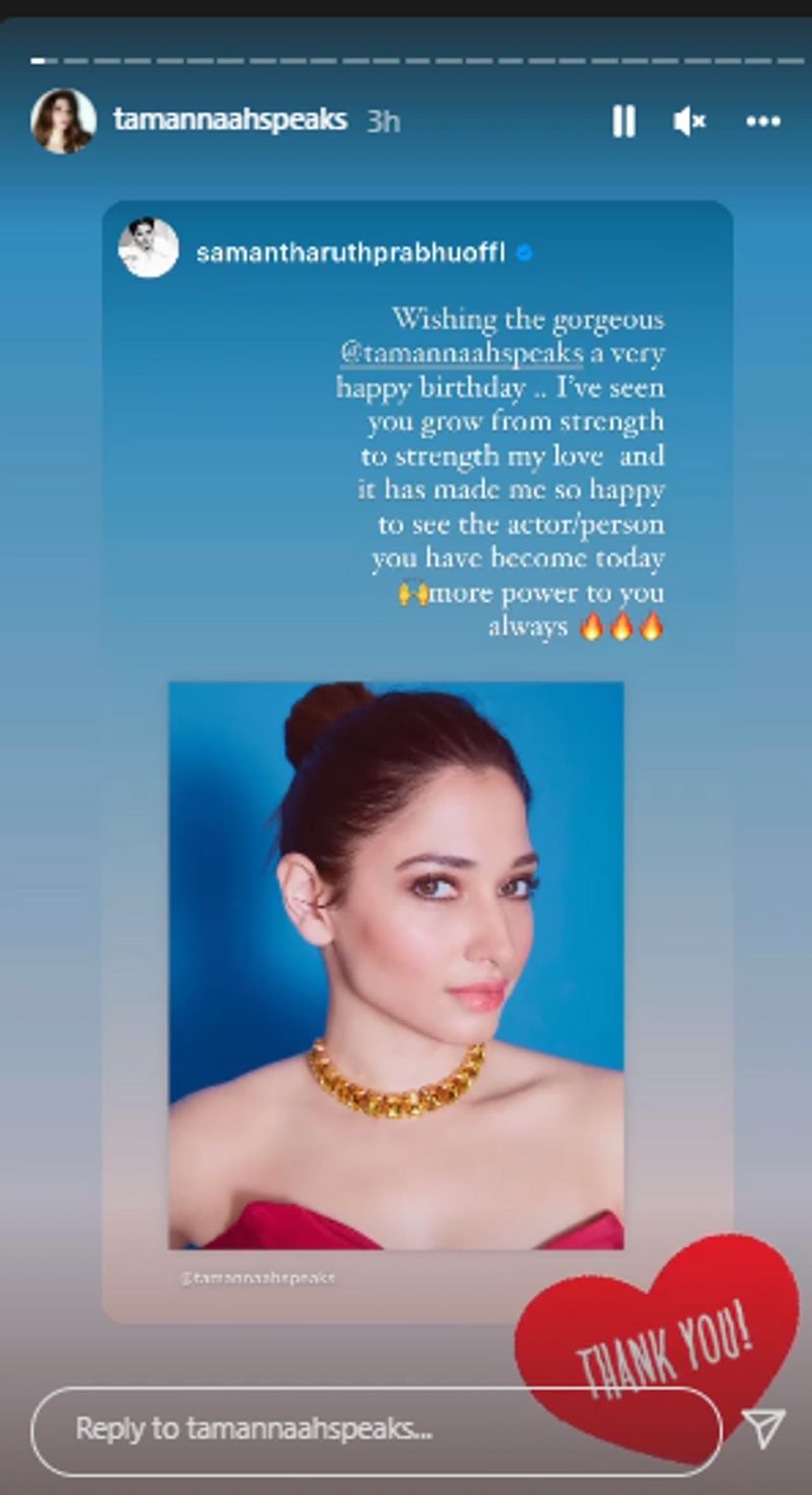 Tamannaah Bhatia's birthday is today. The actress is getting love on her social media feed from her fans and well wishers. Samantha was one of the few stars to send a birthday wish to the actress. She took to her social media handle to write that, ""Wishing the gorgeous @tamannaahspeaks a very happy birthday.. I've seen you grow from strength to strength my love".